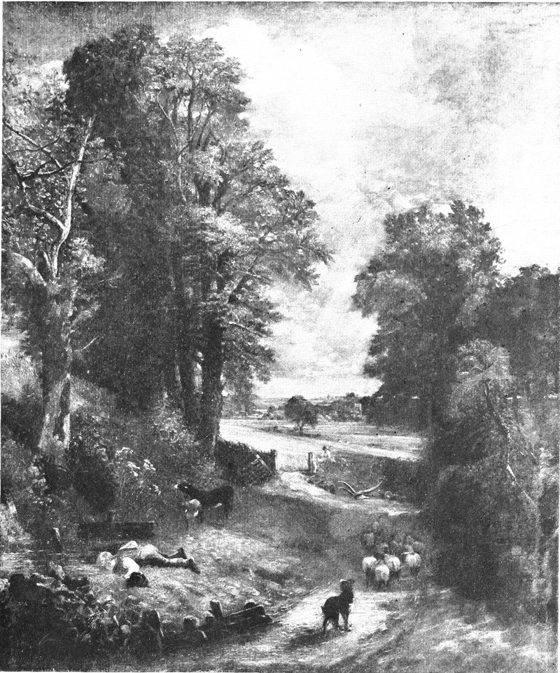Hogarth was a colourist, and the early English School was always one of colour and animation, attempting to follow Nature as closely as possible. Some of the slighter portrait studies of Sir Joshua Reynolds have a strong affinity to the work of the French Impressionists. Richard Wilson was not altogether blind to the beautiful world around him, although he considered an English landscape always improved by a Grecian temple. Gainsborough was decidedly no formalist, and whilst the lifeless group, comprising Barry, West, Fuseli, and Northcote, was endeavouring to inculcate the classical idea, the English Water-colour School began to appear, the Norwich School was in the distance, Turner’s wonderful career had commenced, and Constable, the handsome boy from Suffolk, was studying atmospheric effects and the play of sunlight from the windows of his father’s mill at Bergholt. In 1819 Géricault, one of the leaders of the reaction in France against Classicalism, paid a visit to England. He does not seem to have been greatly influenced by English work, owing no doubt to his lamentably early death. But his visit resulted in Constable and Bonington becoming known in France.