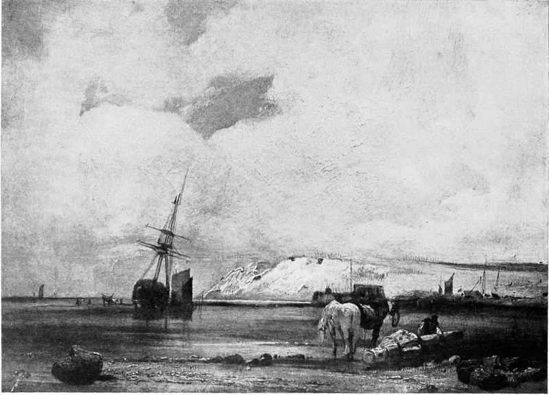 An example of this was to be seen in a large painting by Constable hung in the Royal Academy Winter Exhibition of 1903. The Opening of Waterloo Bridge, exhibited in 1832, was declared by the artist’s enemies to have been painted with his palette-knife. Almost the whole of the canvas, especially the foreground, is dragged over by a full charged brush of pure white, which, catching the uneven surface of the underlying dry impasto work, produces a simple but successful illusion of brilliant vibrating light.