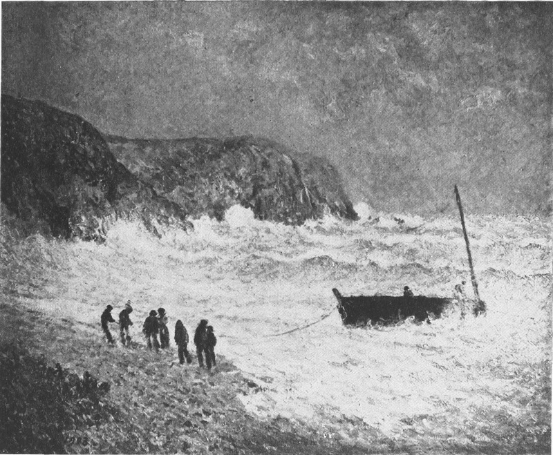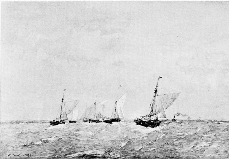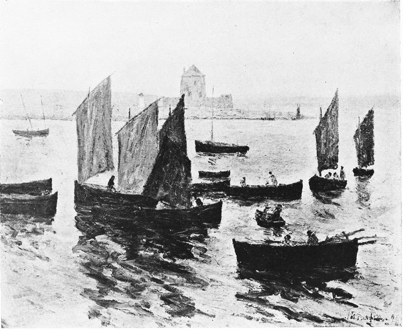 Boudin’s health, weakened by the long privations, had at last broken up. After several futile journeys he returned to his native Normandy, and, whilst working at his easel in his châlet near Deauville in 1898, died almost without warning. By his will he left a rich legacy of pictures to the gallery of his native town, Honfleur. Over one hundred of Boudin’s sketches can now be 15seen in the public gallery of Havre. Boudin’s connection with modern Impressionism is chiefly the influence generated by a strong enthusiasm for working “en plein air” and a deep love of Nature. His dominant colour, almost to the end of his life, was grey—a grey beautiful in its range and truthful in its effect. Personally Boudin had the head of an old pilot, with healthy ruddy complexion, white beard, and keen blue eyes. He spoke slowly in low monotonous tones, was doggedly tenacious of an idea, had strong artistic convictions. He was modest to a degree, and when he sought honours they were for brother artists, never for himself. His highest ambition was reached when the Town Council of Honfleur named a street “Rue Eugène-Boudin.” This street, long, narrow, hilly, with many rough places and occasional pitfalls, typifies the artist’s own life. After his death the town went further. Aided by M. Gustave Cahen, president of the “Société des Amis des Arts,” Honfleur erected a fine statue of its talented son by the jetty, where he had so often painted his favourite scenes of sea and shipping.