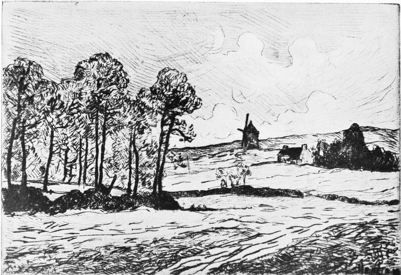 In the sale-rooms Jongkind’s water-colours and etchings are now reaching very high prices, although one cannot agree that they are his most remarkable creations. Works the artist was content to sell for £4 to £8 now change hands under the hammer at sums ranging from £160 to £800. The best canvases were painted towards the end of his life, especially those depicting the luminous atmosphere of the beautiful Dauphiné countryside. His large landscapes are extremely unequal, somewhat hard and dry in technique, and more or less stereotyped in the choice of subject. His pictures do not always convey the true feeling for atmospheric effect, and many are simply experiments which lack the great quality of charm. Without a doubt he possessed extraordinary ability, but he lacked the illuminating spark of genius. He pointed out a way he was not himself strong enough to follow.