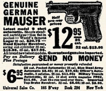 25 cal. Pocket Automatic; 25 cal. Blue Steel Army Automatic $8.45; 32 cal. $10.45; Officer’s Automatic, 3 safeties, 25 cal. $11.95; Military Trench Automatic, 32 cal. 10 shot extra magazine FREE, $11.65. Just like you used over there. Imported Top Brake Revolver. 32 cal. $8.65; 38 cal. $8.95.