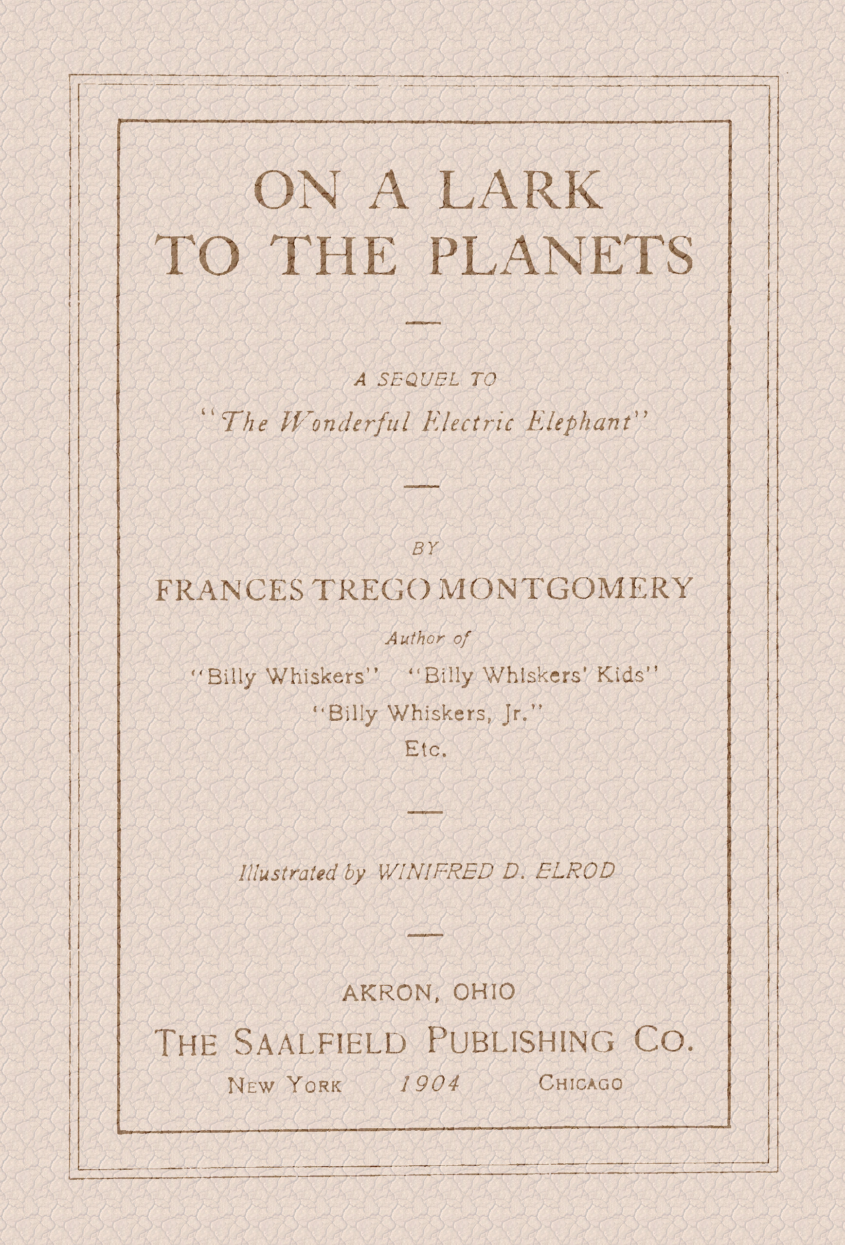 It was midnight by the hands of the clock, but the boundless aerial space through which they sped was lighted by myriads upon myriads of twinkling stars. On and still on through diamond-specked space the Elephant floated safely. Above, below, to right, to left, and round about in all directions, flashing, glittering globes of light were to be seen and of such dazzling hues and colors as had never been dreamed of by earth-bound mortals. The planet Neptune was wrapped 13in a bluish-green vapor; Uranus seemed a blinding white; Saturn emitted a yellow light; Jupiter shone like a glorious, crimson jewel; Mars blazed forth fiery red beams, while Mercury seemed bathed in a metallic green color.