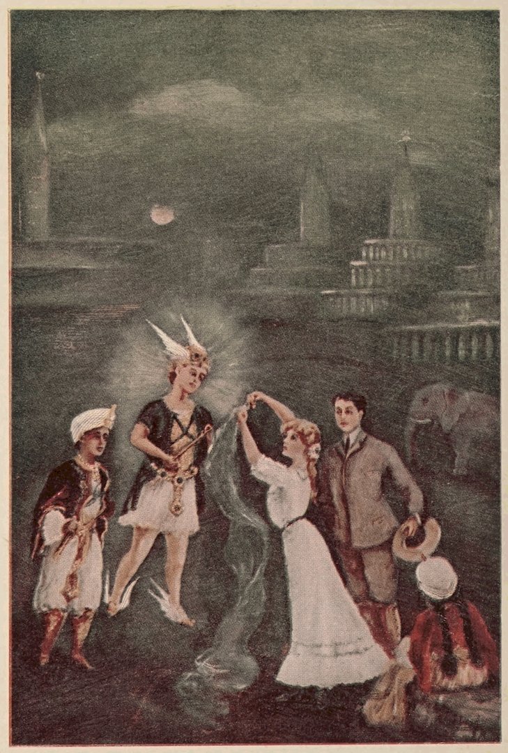 21Those who had disappeared soon returned and approached the Elephant, for they seemed fearless people after all, and then our young travelers slipped into their new white robes, which, by the way, I forgot to tell you about. They had found them enclosed in little jeweled acorns, which they thought were only watch-charms, but accidentally having touched a hidden spring in one, it opened and out fell a robe. They were fine as cobweb, soft as silk, changeable as the colors of a soap bubble and had the wonderful properties of making one invisible, giving one any outward appearance one might wish to assume, and at the same time enabling one to understand any language spoken within hearing. After donning these magic garments they found they were dressed like the little Mercurians, even to the wings on their heads and feet. They also found that they could understand all that was said by these sprightly people, for their language consisted entirely of short words and abbreviations. You must remember that 22these people are always in a hurry so have no time for long words or expressions. When asked what their chief occupations were, one of the inhabitants answered that they consisted almost entirely in conveying messages between the earth and the planets. “We also watch over the people on earth upon whom the rays of Mercury fell at the moment of their birth. They possess the nature and characteristics that the influence of this planet is said to impart and so are our especial proteges.”