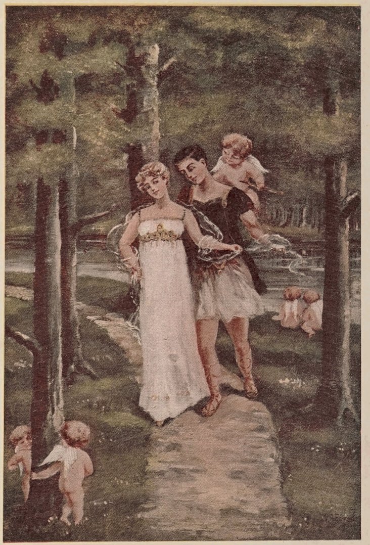 37This conversation took place in a beautiful park where winding paths led to sylvan retreats; where miniature lakes were studded with pleasure-boats, sailing slowly along filled with happy, laughing people; where flowers of every hue and color filled the air with sweet, spicy perfumes; and where birds of endless variety and color of plumage bathed in the sparkling fountains or flitted and sang among the branches of the trees. Coming toward them, hand in hand along one of the many footpaths, were two beautiful beings accompanied by little flying cupids who at times lighted on their shoulders, then again on their heads, or flew about chasing each other, cooing like so many white doves.