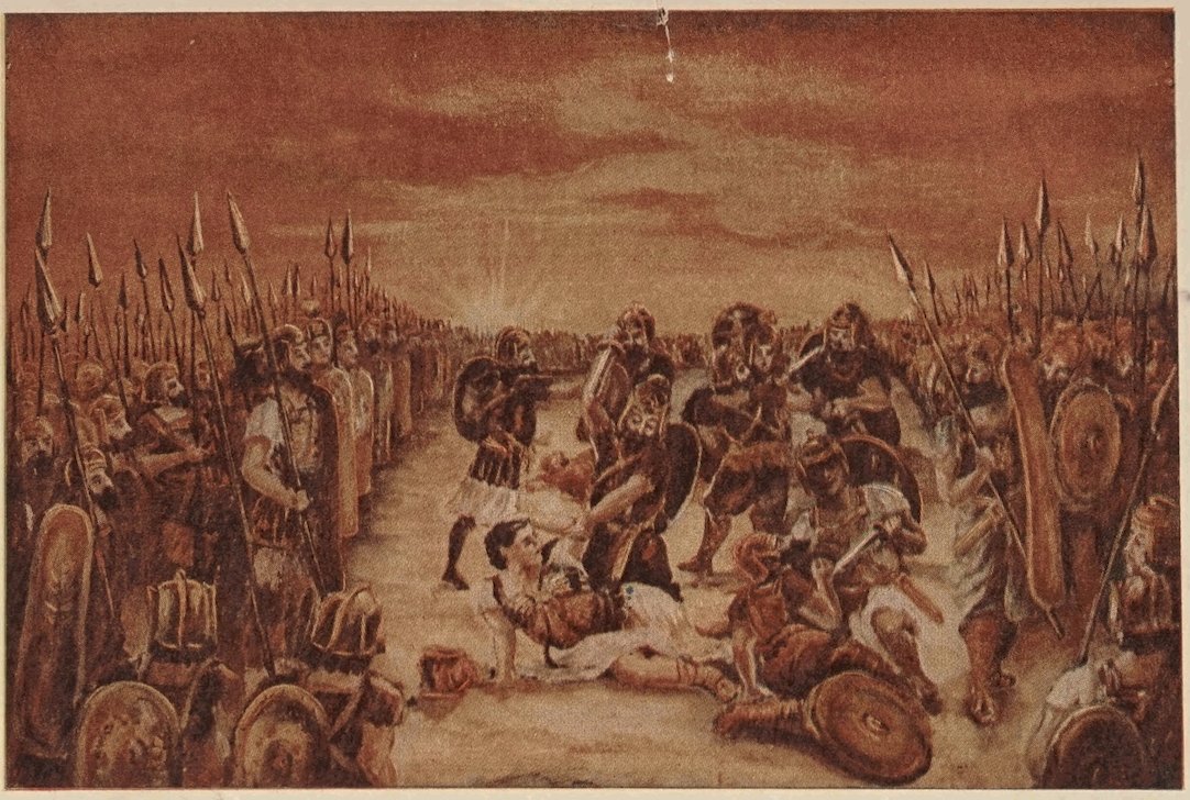 Following them came Jupiter in all his royal splendor like some conquering king or hero. His jeweled chariot was drawn by four milk-white horses; his robes were royal purple lined with spun gold and bordered with precious gems. On his head he wore a helmet of gold on which with outstretched 165wings rested an eagle—a bird dedicated to him by the ancients.
