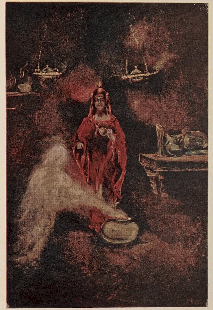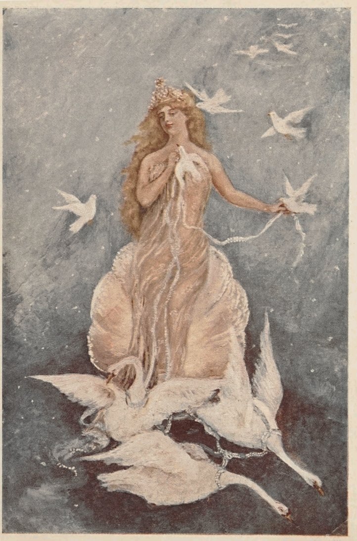Twelve white pigeons heralded the approach of Venus in her pink-tinted shell-chariot emblazoned with emeralds, pearls, and corals, and drawn by snow-white swans, which were dedicated to her by the ancients. Her robe was of palest green, sprinkled with pearls and embroidered to represent seafoam. A magic girdle encircled her waist. In her hands she carried violets and maidenhair 166ferns. At her side stood a basket of pomegranates, sweet pears and figs. As the chariot passed, one could scent the perfume of thyme, myrtle, and musk, perfumes especially pleasing to her, as was the flavor of the fruits at her side.