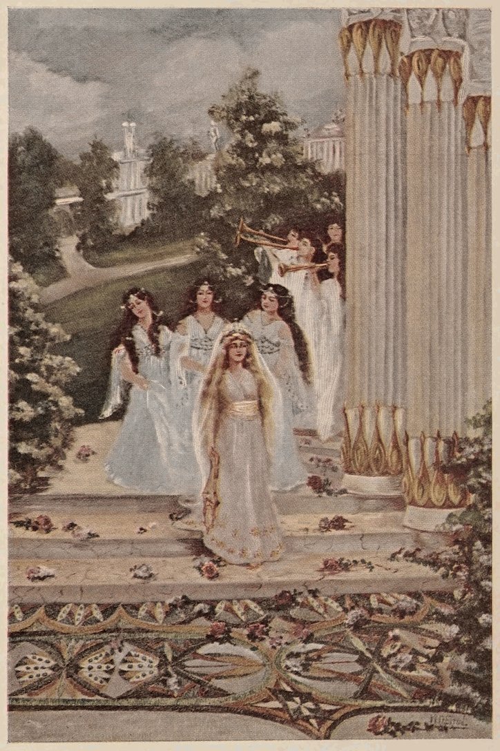 In less time than it took them to count one, two, three, they were at their destination and were barely seated when the Princess exclaimed, “Sh! I hear strains of music,” and looking in the direction from which the sounds came, they saw a beautiful float gliding smoothly along. On it were standing twelve youths and twelve maidens playing upon golden harps and horns. They were crowned with roses, while violets and myrtle were profusely festooned about them. The youths had only a spotted leopard skin thrown across their shoulders while the maidens were attired in filmy white slips with belts of blue ribbon.
