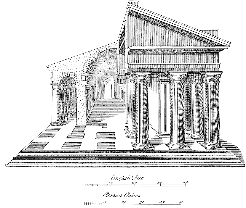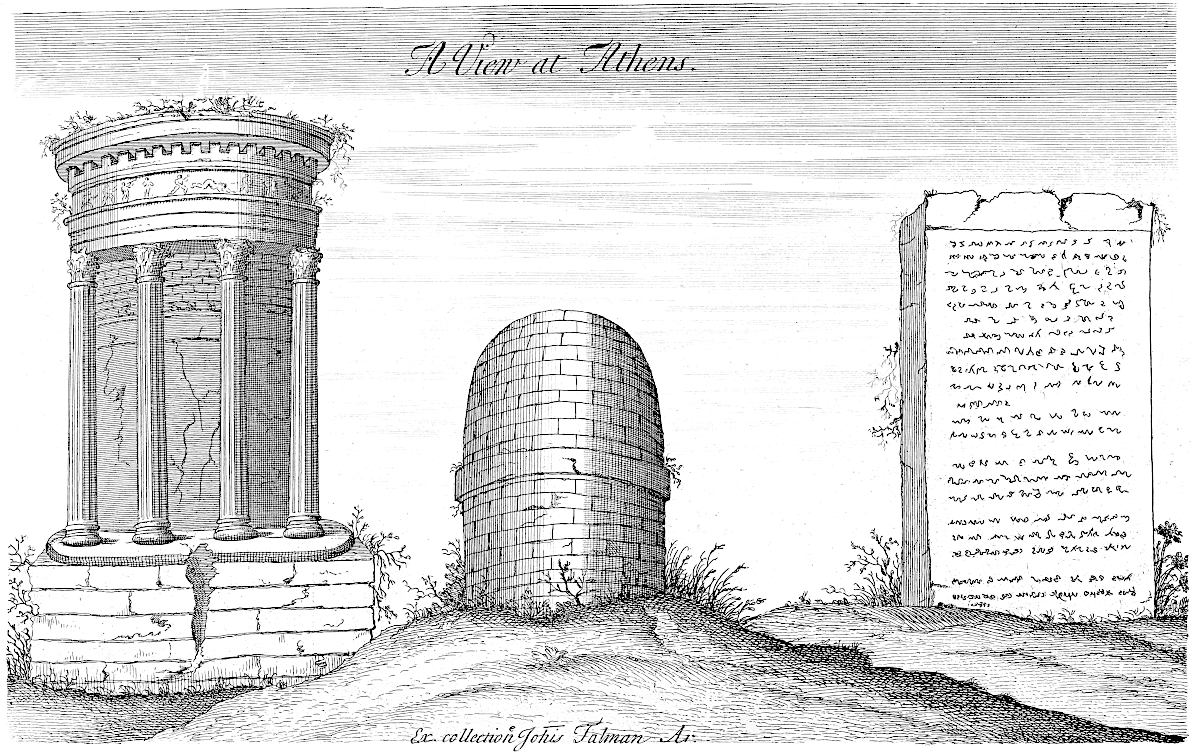 Two or three of the plates are inserted only as heads, being not referred to in the discourse, as Tab. VIII. the ground-plot of the ruins of Whitehall. I myself never saw the palace, but was pleased that I chanced to take this draught of its ruinous ichnography, but the very week before totally destroyed. Thus much I thought owing to the venerable memory of that name, which is ever the word at sea with British ships, and which makes the whole world tremble. Tab. X. is an ancient seal of the bishops of Norwich.[1] This plate the learned and curious Mr. le Neve, Norroy king at arms, lent me out of his good will to promote the work: the seal is remarkable for having letters upon the edge, represented in the empty ringlet; the manner of it is like our milled money; but how it was performed in wax, is not easy to say. Tab. XV. was likewise lent me by Mr. Norroy abovesaid. I design always, in these collections of mine, to insert one plate in a hundred, of some person’s effigies that has deserved well of the antiquities of Britain: it is but a just piece of gratitude to their memory. Tab. XL. (the Greek view at Athens) I took from an original drawing in Mr. Talman’s collection. I have some more of that sort: though they relate not to Britain, I do not fear the reader will be displeased with me on that account. How much rather ought we to lament the scarcity of such! What noble monuments of Greece are sunk into eternal oblivion, through want of Drawing in travellers that have been there in great numbers, or for want of encouragement to those that are able! With what regret do I mention that most beautiful temple of Minerva in the citadel of Athens, without dispute the finest building upon the globe, anno 1694! that year it was casually blown up with gunpowder, and not a drawing of it preserved.