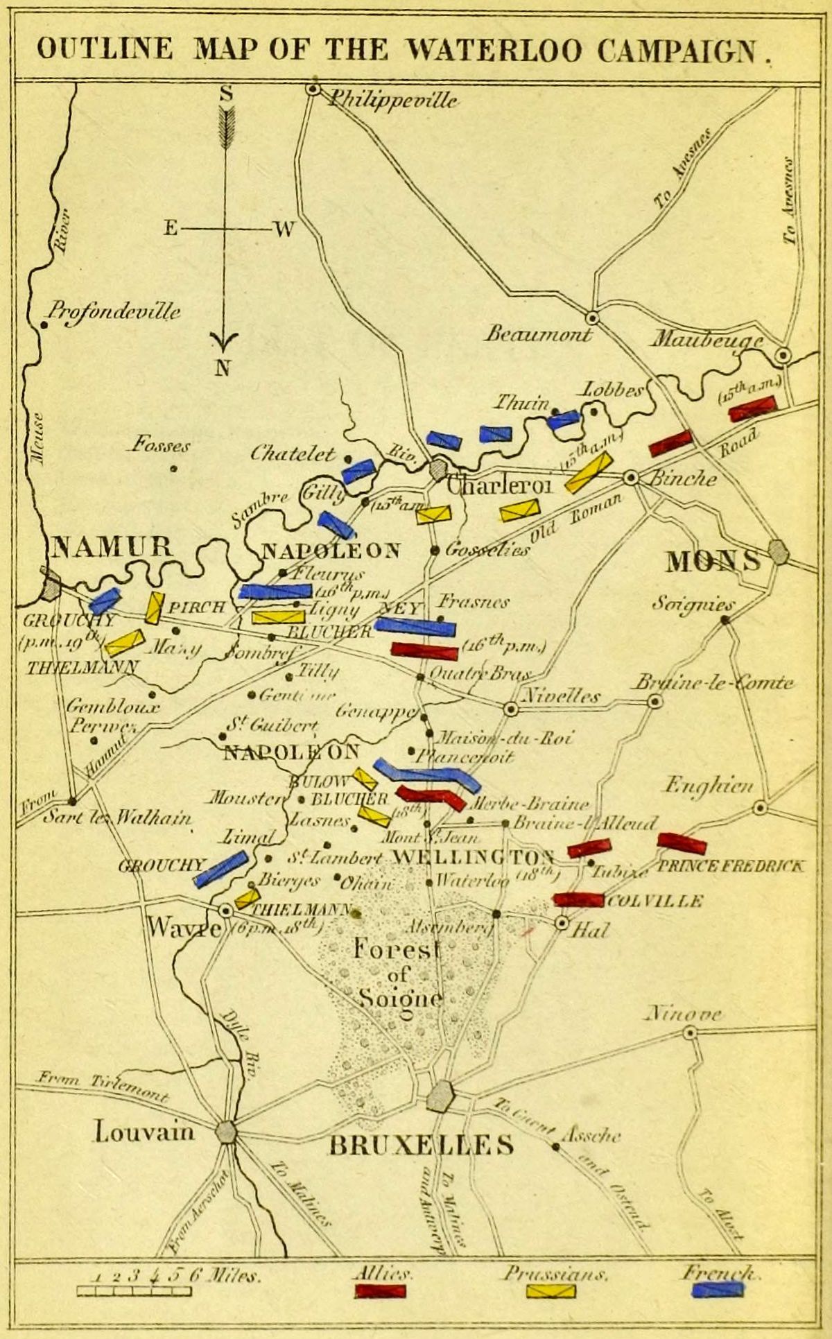| Napoleon leaves Elba; lands in France.—Louis XVIII quits Paris.—Napoleon, joined by the army, arrives in Paris.—Hostile declaration of the great powers of Europe against Napoleon, which he treats with contempt, and prepares for war.—France soon appears one vast camp.—Allied armies assemble in Belgium.—The duke of Wellington arrives and takes the command; adopts precautionary measures.—In consequence of rumours, his Grace issues a secret memorandum, and draws the army together.—Strength, composition and distribution of the allied, Prussian, and French armies.—Continued rumours; and certain intelligence of the enemy’s advance.—Importance of holding Brussels.—Napoleon’s attempt to surprise us frustrated.—Blücher concentrates his forces.—Napoleon joins his army, and issues his order of the day; attacks the Prussian outposts, and takes Charleroi.—Intelligence reaches the Duke.—Distribution of the enemy.—The Duke orders the army to prepare, and afterwards to march on Quatre-Bras.—The duchess of Richmond’s ball.—The troops in motion at early dawn.—His Grace proceeds by Waterloo to Quatre-Bras, and from thence to Ligny, where he meets Blücher, whom he promises to support, and returns to Quatre-Bras.—Picton’s division and the Brunswickers arrive at Quatre-Bras, and are attacked by the French left column under Ney; more of our troops arrive.—Outline of the battles of Quatre-Bras and Ligny.—Observations. | 1 | |