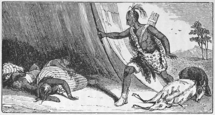 In their physical character, the American Indians are considered by Blumenbach as forming a particular variety of the human species, differing, though not very widely, from the Mongolian. Believing, as we do, that the New World was peopled from the Old, and considering that the Mongol race was situated nearest to the point where Asia and America come almost into contact, we incline to ascribe these variations merely to a change of outward circumstances. The face is broad and flat, with high cheek-bones; more rounded and arched, however, than in the allied type, without having the visage expanded to the same breadth. The forehead is generally low; the eyes deep, small, and black; the nose rather diminutive, but prominent, with wide nostrils; and the mouth large, with somewhat thick lips. The stature, which varies remarkably throughout the Continent, is, in the quarter of which we treat, generally above the middle size. This property, however, is confined to the men, the females being usually below that standard, a fact which may be confidently ascribed to the oppressive drudgery they are compelled to undergo. The limbs, in both sexes, are well proportioned; and few instances of deformity ever occur.