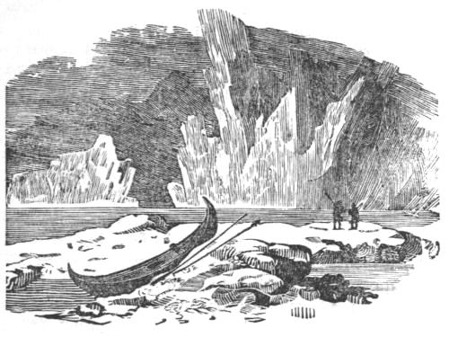 “Their knowledge of wood seemed to be limited to some heath of a dwarfish growth, with stems no thicker than the finger; and, accordingly, they knew not what to think of the timber they saw on board. Not being aware of its weight, two or three of them, successively, seized on the spare topmast, evidently with the view of carrying it off; and, as soon as they became familiar with the people around them, they showed that desire of possessing what they admired, which is so universal among savages. The only thing they looked upon with contempt, was a little terrier dog;—judging, no doubt, that it was too small for drawing a sledge. But they shrunk back, as if in terror, from a pig, whose pricked ears and ferocious aspect (being of the Shetland breed) presented a somewhat formidable appearance. This animal happening to grunt,[31] one of them was so terrified, that he became, from that moment, uneasy, and appeared impatient to get out of the ship. In carrying his purpose into effect, however, he did not lose his propensity to thieving, as he seized and endeavoured to carry off the smith’s anvil: finding that he could not remove it, he laid hold of the large hammer, threw it on the ice, and following it himself, deliberately set it on his sledge, and made off.”