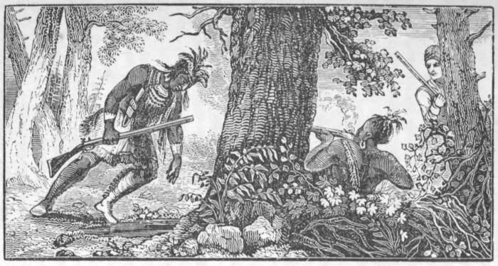 A tall Indian was seen, at length, through the glimmering of the fire, which was getting low. He moved cautiously towards them, skulking, as an Indian always does. He seemed to suspect, at first, that a guard might be watching, but seeing none, he came forward more boldly, rested on his toes, and was seen to move his finger, as he counted the thirteen men, sleeping, as he supposed, by the fire. He counted them again, and retired; another came up, and did the same. Then the whole party, sixteen in number, came up and glared silently at the logs, till they seemed to be satisfied they[242] were fast asleep. Presently they took aim, fired their whole number of guns upon the logs, yelled the horrid war-whoop, and pushed forward to murder and scalp their supposed victims. The Sergeant and his men were ready for them; they fired upon them, and not one of the Indians was left to tell the story of that night. The Sergeant reached the army in safety.
