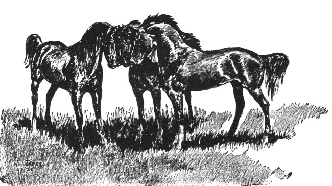 They was all jealous of one another and fought amongst themselves to be the only one near him, and his mother, of course she'd declared herself from the start, and it was took for granted from all around that her place in Smoky's heart couldn't be considered, and all knowed better than try and chase her away from him. Fillies and old mares, young geldings and old ponies and all, had it out as to which was the most fit to tag along and play with Smoky and keep a watchful eye over him along with his mammy. All wanted the job, but a big buckskin saddle horse who all the time had been the boss of the herd took it to hand to show them that he would be the all around guardeen for Smoky, and second only to his mammy. He delivered a few swift kicks, pounded on some ribs, left teeth marks on shiny hides, and after taking one last look and making sure that all was persuaded grazed out towards Smoky who by his mammy had watched the whole proceeding with a heap of interest.