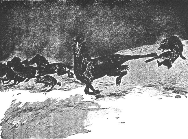 The cayote had turned and quicker than a flash made a jump for Smoky's throat.—The generations of mustang blood that'd fought the lobo and cougar and which was the same blood that flowed in Smoky's veins is all that saved the colt. That inherited instinct made him do the right thing at the right time, he whirled quicker than lightning and let fly with both hind feet with the result that the cayote's teeth just pinched the skin under his jaws. But even at that, he wasn't going to get rid of his enemy (it was a sure enough enemy this time) that easy, and as he kicked he felt the weight of the cayote, and then a sharp pain on his ham strings.
