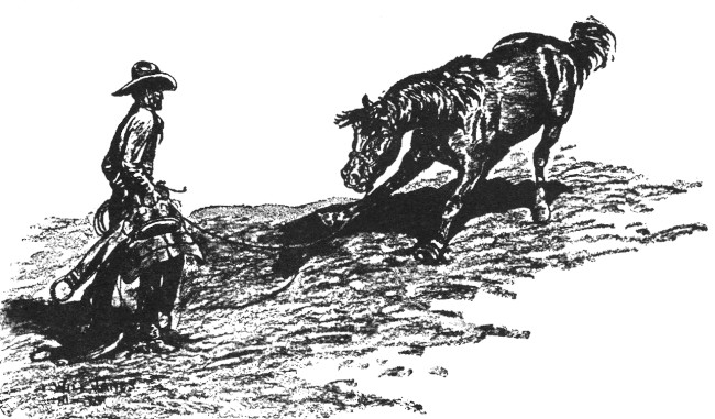 The man collecting old wore out and crippled horses had come along and led him away. He had a little salt-grass pasture a short distance out of town, and there's where he took the old horse. He turned him loose amongst a few more old horses, and would keep him there till the time come when some "chicken man" around town would need the carcass of one of the horses to feed to his chickens; then the horse what looked like it had the shortest to live would be killed and hauled away.
