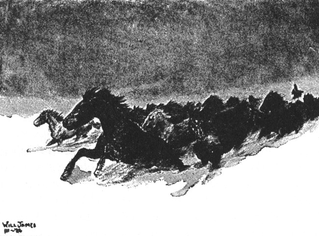 He watched Smoky a while longer and till he got acquainted some, and at last deciding it'd be for the best to let him go, he reined his horse out of the gate and let the bunch run by. The old pony seemed to hesitate some as the bunch filed out, he liked their company mighty well but something held him back; then a horse nickered, and even tho that nicker might not of been meant for him, it was enough to make him decide. He struck out on a high lope and towards the bunch;—one of the little colts and full of play waited for him, and nipping the old horse in the flanks run by his side till the bunch was caught up with—Smoky was living again.