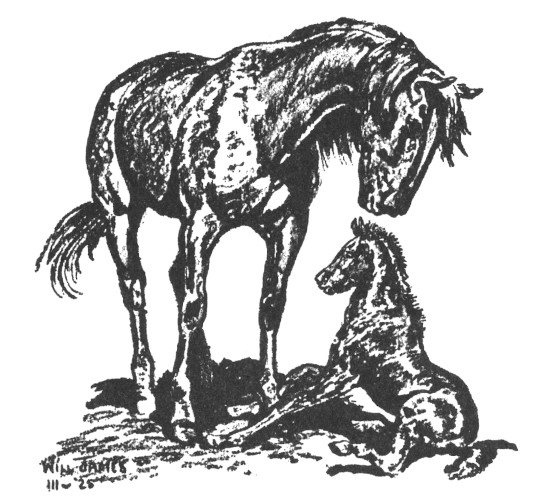 Smoky wasn't quite an hour old when he begin to take interest in things, the warm spring sun was doing its work and kept a pouring warmth all over that slick little black hide and right on thru his little body till pretty soon his head come up kinda shaky and he begin nosing around them long front legs that was stretched out in front of him. His mammy was close by him and at the first move the colt made she run her nose along his short neck and nickered. Smoky's head went up another two inches at the sound and his first little answering nicker was heard, of course a person would of had to listen mighty close to hear it, but then if you'd a watched his nostrils quivering you could tell that's just what he was trying to do.