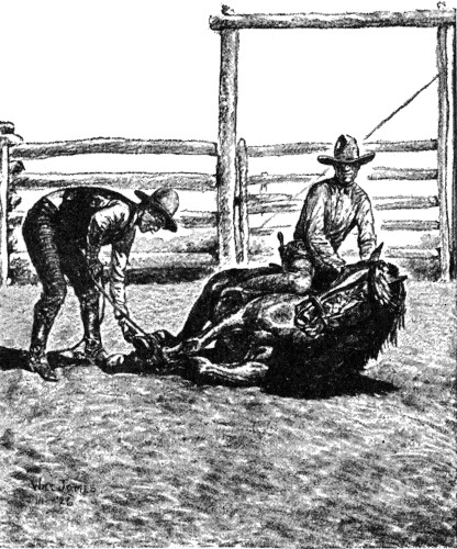 All would of been well maybe, only his mammy nickered "that's a good boy," and that's what queered Smoky. His head went up proud as a peacock and he forgot all about keeping his props stiff and under him. Down he went the whole length of his legs, and there he layed the same as before.
