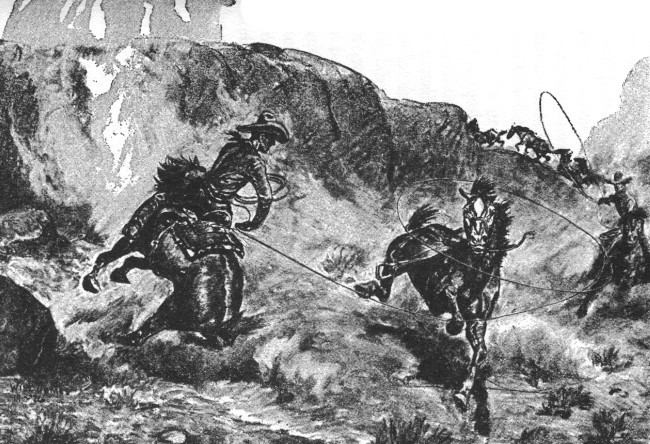 It was a mighty good thing he done that, for soon as one of the bunch got wind of him and raised a head, there was a snort, they came to life and was on the run in a split second. Down the side of the canyon they went, a cloud of dust and the cowboy following.