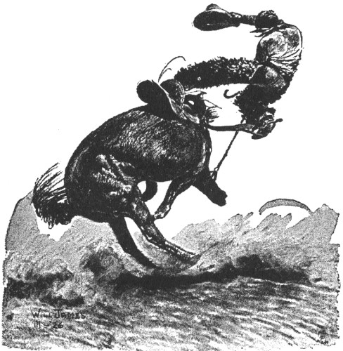 Clint was kinda proud in hearing that. He'd heard of The Cougar and that pony's bucking ability even up to the Canadian line and acrost it, and to himself he says: "That Smoky horse never did do things halfways." But he got to wondering, and then asked how come the pony had turned out to be the kind of a horse, that, the stable man didn't know. It was news to him that the horse had ever been anything else, and as he says:
