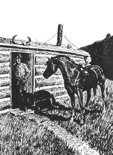 With the green grass growing near an inch a day, Clint wasn't worried much on how old Smoky was making it. He figgered a horse couldn't die if he wanted to, not on that range at that time of the year, but some day soon he was going to try and locate the old horse and find out for sure how he really was. Then a lot of work came on which kept the cowboy from going out soon as he wanted to, and then one morning, bright and early, as he stepped out to get a bucket of water, the morning sun throwed a shadow on the door, and as he stuck his head out a nicker was heard.