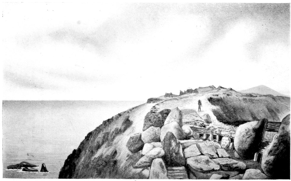 50. The outermost of the three hillocks on the eastern volcano on which the Spaniards set up the crosses in 1770. Half of it has been worn away by coastal erosion (fig. 78).