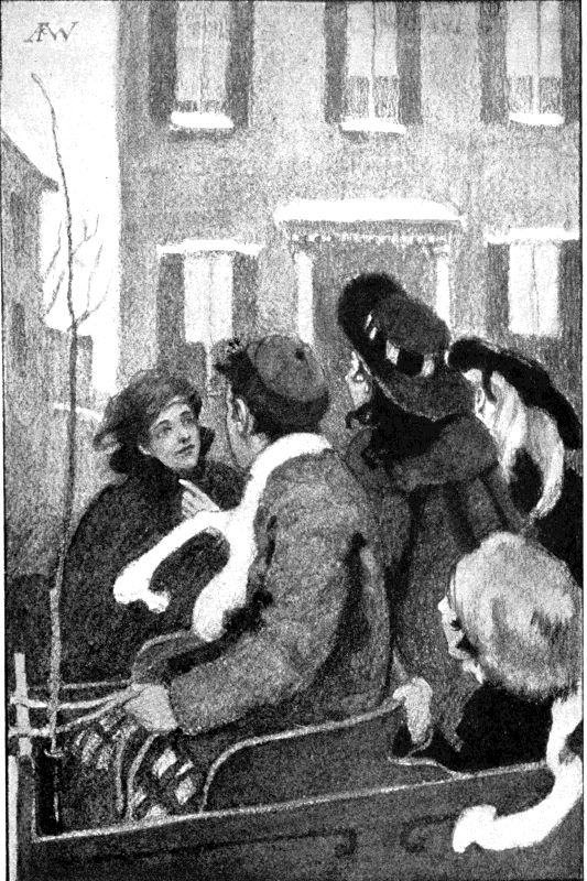 “It’s too cold to play outdoors,” said Betty White, dancing on ahead, her bag of school-books swung over her shoulder. Betty’s brown eyes[Pg 2] danced like her feet, and so did the capes to her long blue coat and the wavy brown hair tied back with a bow of wide white ribbon.