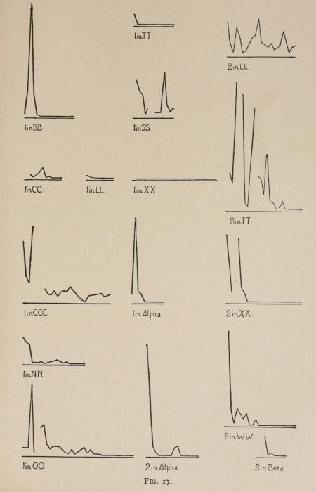 In our last illustration, John’s thinking of ‘9 × 7 equals 63,’ the effect on John’s behavior may be so complicated by other conditions in John, and is so subject to the particular conditions which we name John’s ‘will,’ that the observers would often be at loss except for John’s verbal report. Not that the observer is restricted to that. If John does the example 217 × 69 in the usual way, it is a very safe inference that he thought 9 × 7 equals 63, regardless of the absence of a verbal report from him. But often there is little else to go by. To John himself, on the contrary, it is easier to be sure that he is thinking of 9 × 7 equals 63, than that he has a particular sort and strength of toothache. Consequently if we suppose John to be thinking of that fact while under observation, and the twenty observers[12] to be required to identify the fact he is thinking of, it is sure that there might be an enormous variability in their guesses as to what the fact was and that his testimony might be worth far more than that of all the other nineteen without his testimony. His observation is influenced by the action of the neurones in his central nervous system as theirs is not, and, in the case of the thought ‘9 × 7 equals 63,’ the action of these neurones is of special importance.