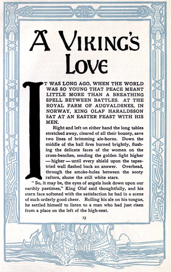 While yet a school-girl, she wrote a number of plays for amateur theatricals, and some short stories. Her first book, “The Scrape that Jack Built,” was published in 1896, but the tales of the North, with the daring exploits of its Heroes, were alluring, and she made a thorough and exhaustive study of Northern literature—Paul Du Chaillu’s “The Viking Age,” “Frithiof’s Saga,” Rasmus B. Anderson’s introduction to Norse Mythology, and nearly forty other works of the same character. Among these should be specially mentioned “Havamal,” which comprises the sayings of Odin and is regarded as the laws of the Vikings, and from which quotations appear at every chapter in her two great historical novels, “The Thrall of Leif the Lucky” and “The Ward of King Canute.”