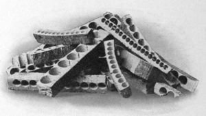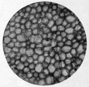 The many different grades of granulated[Pg 43] cork, made by grinding up cork waste, find a wide sphere of usefulness for packing and heat insulating purposes. In this last mentioned field, in fact, cork now ranks preeminent. Its peculiar structure, which may be seen under the microscope—myriads of sealed air cells, impervious to air and water—renders it not only a splendid nonconductor of heat, but also nonabsorbent of moisture.