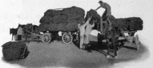 Broad sheets are placed in a baling box to form the bottom of the bale, and above them are laid smaller pieces, which are covered in turn with larger sections; then the whole mass is subjected to pressure to render it compact, afterward being bound up securely with steel hoops or wire.[Pg 23]