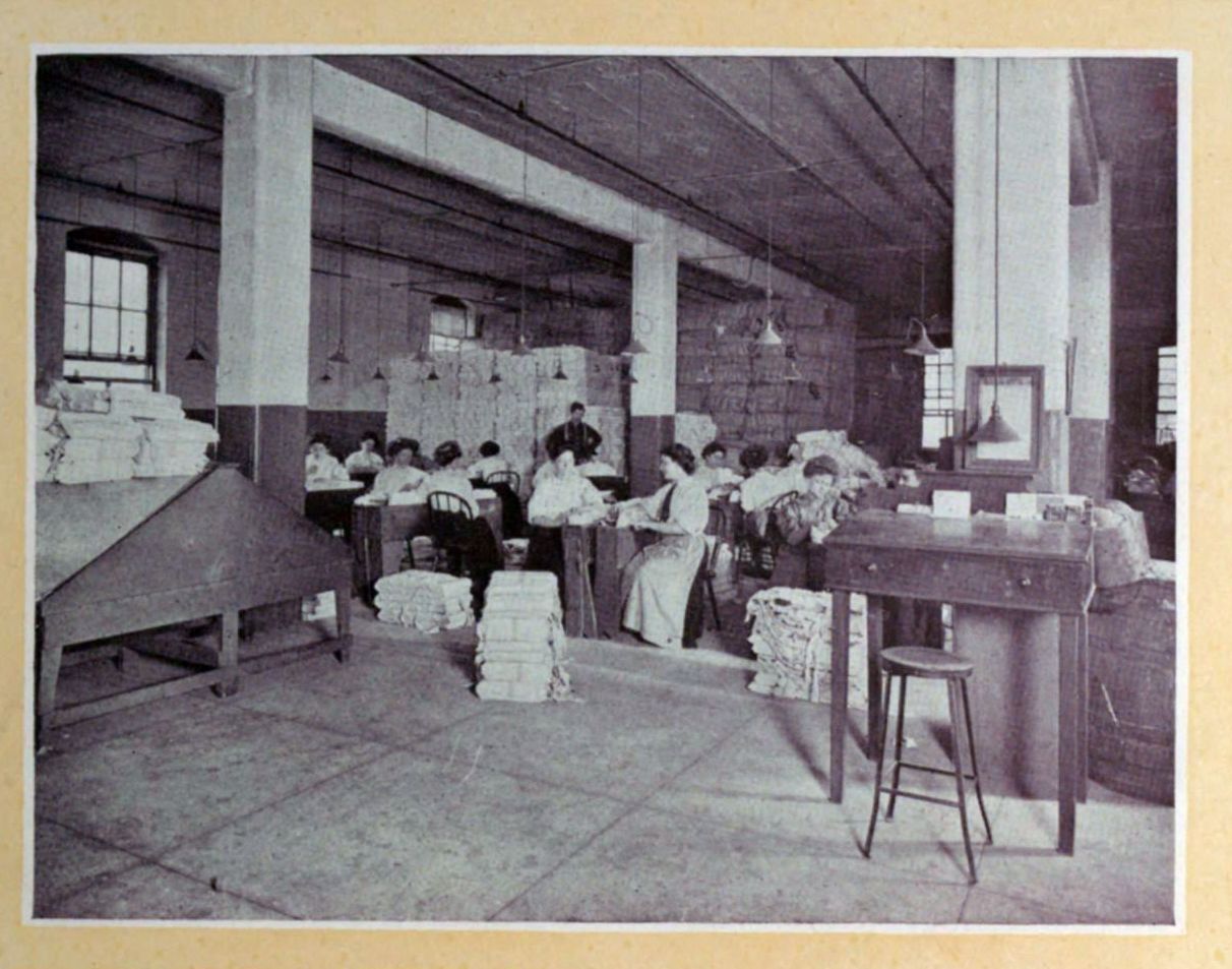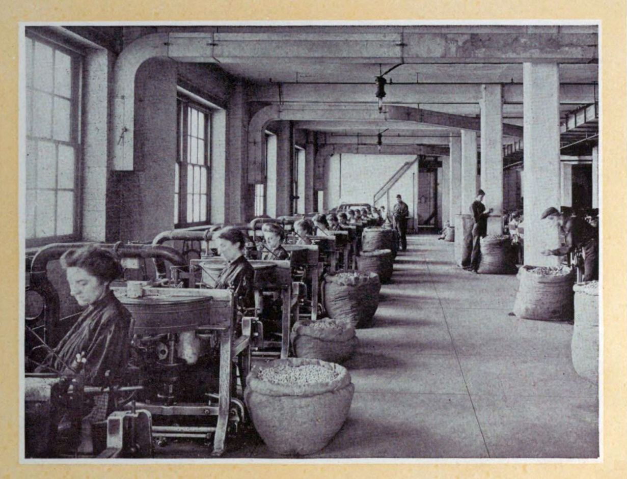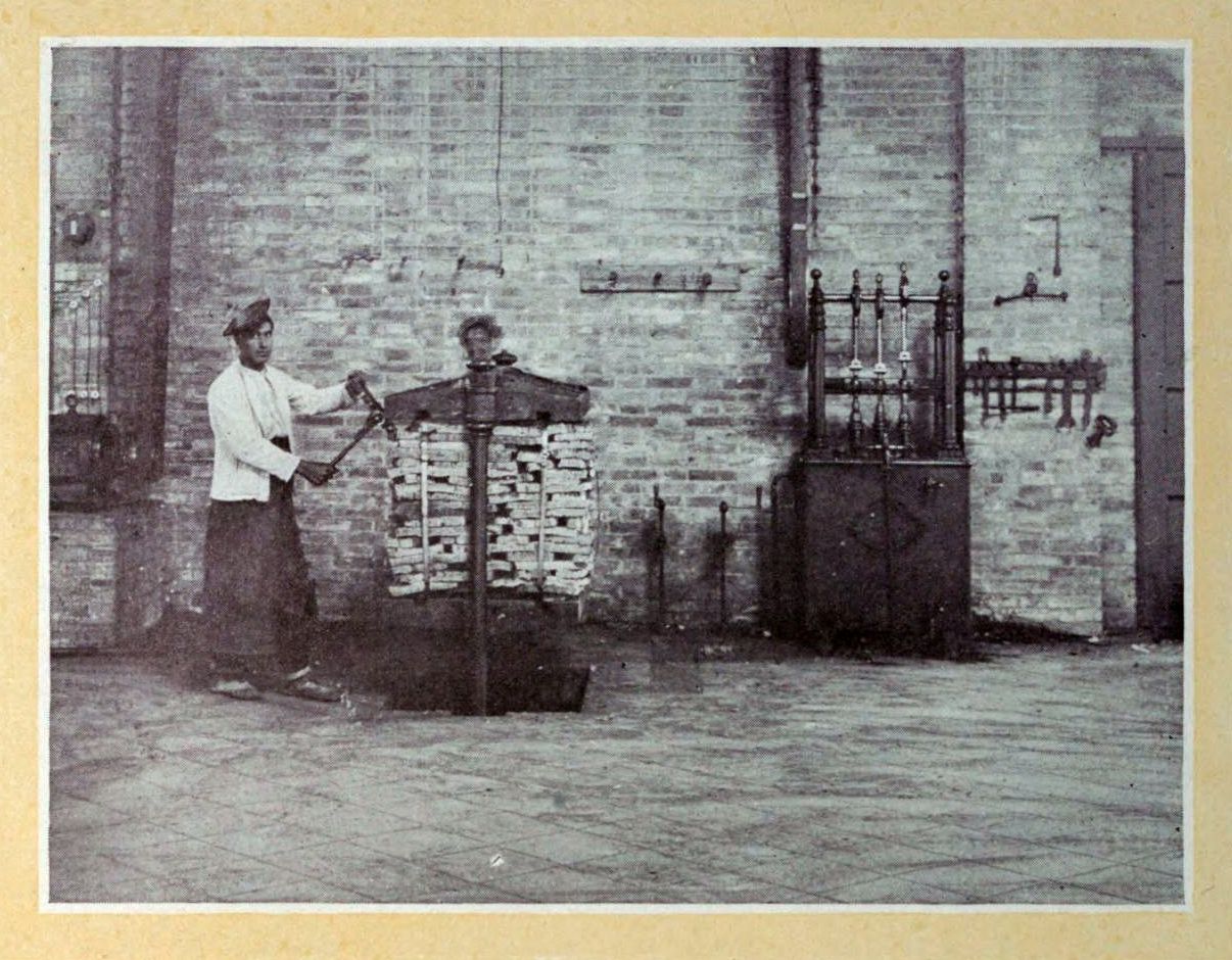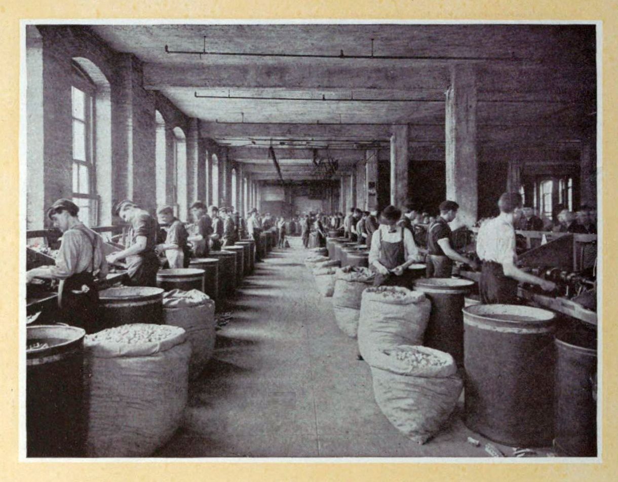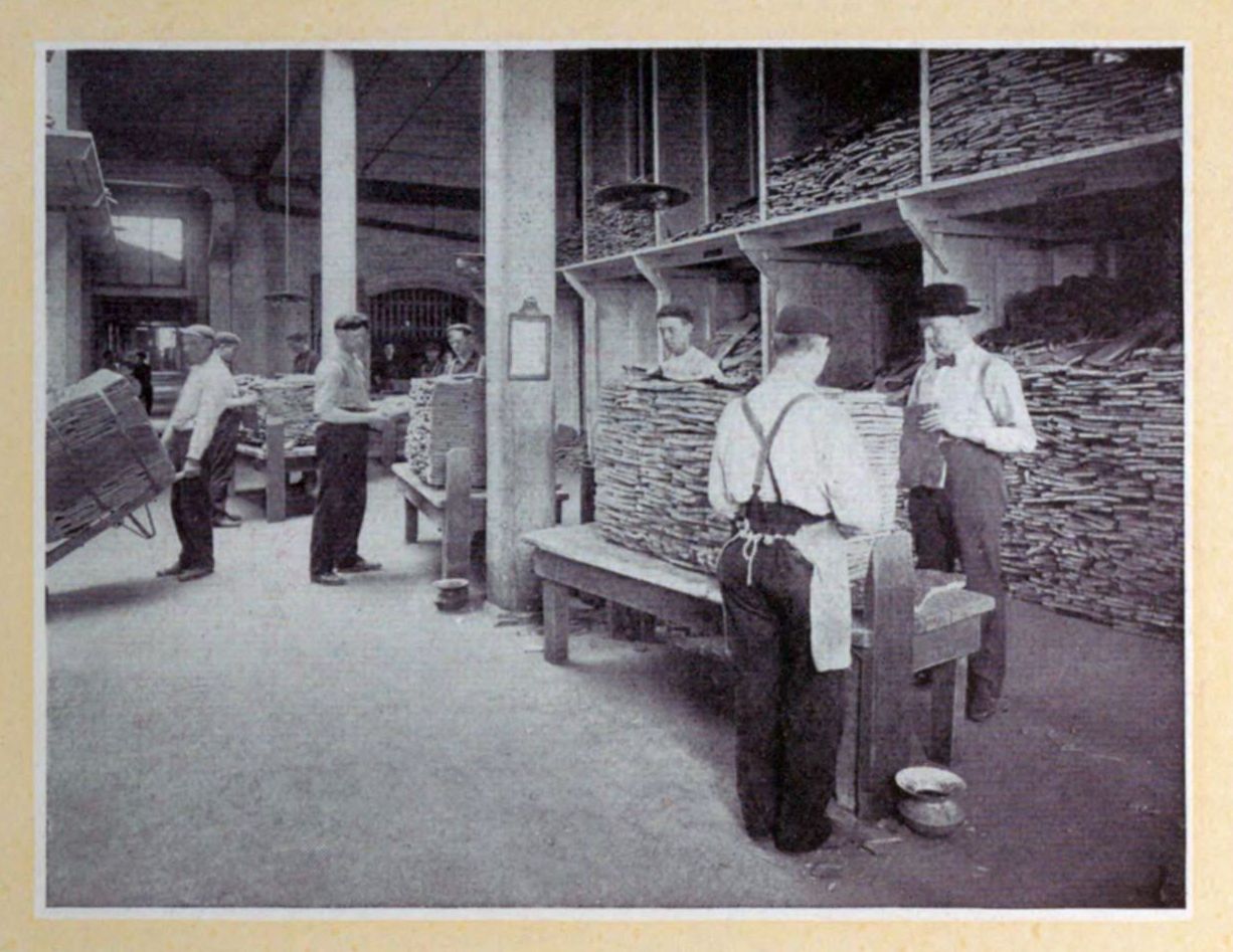 Both “straights” and “tapers” next journey to the washing rooms. There dumped in great vats, thousands at a time, they are carefully washed and then dried by being whirled about dizzily in great revolving cylinders of wire net located in heated chambers.