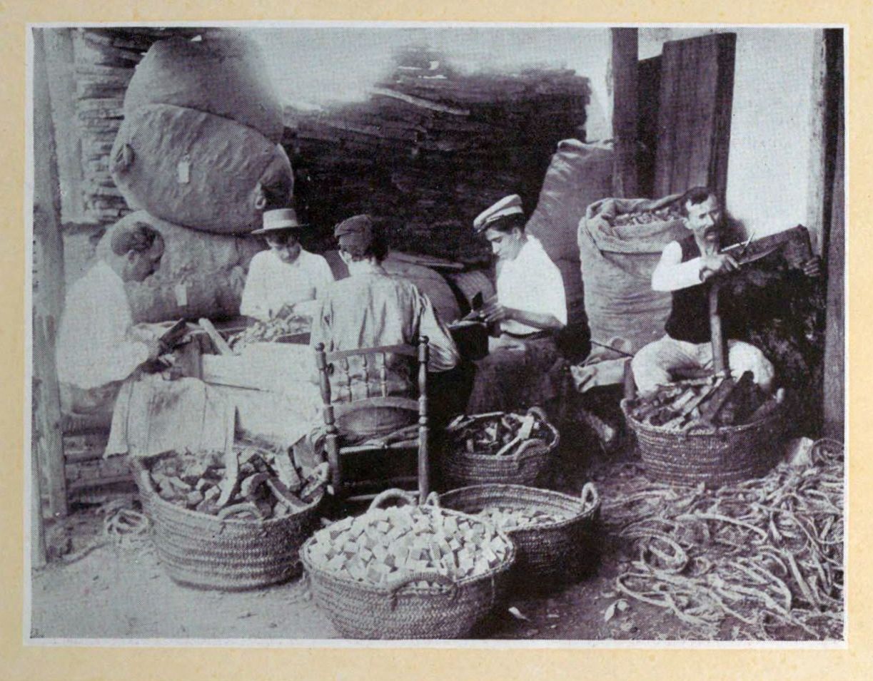 Whole families participate, slicing the bark into strips, then into squares, and finally cutting the corks from the square blocks slowly and laboriously. This hand method of manufacture is gradually disappearing as more and more machinery comes into general use.