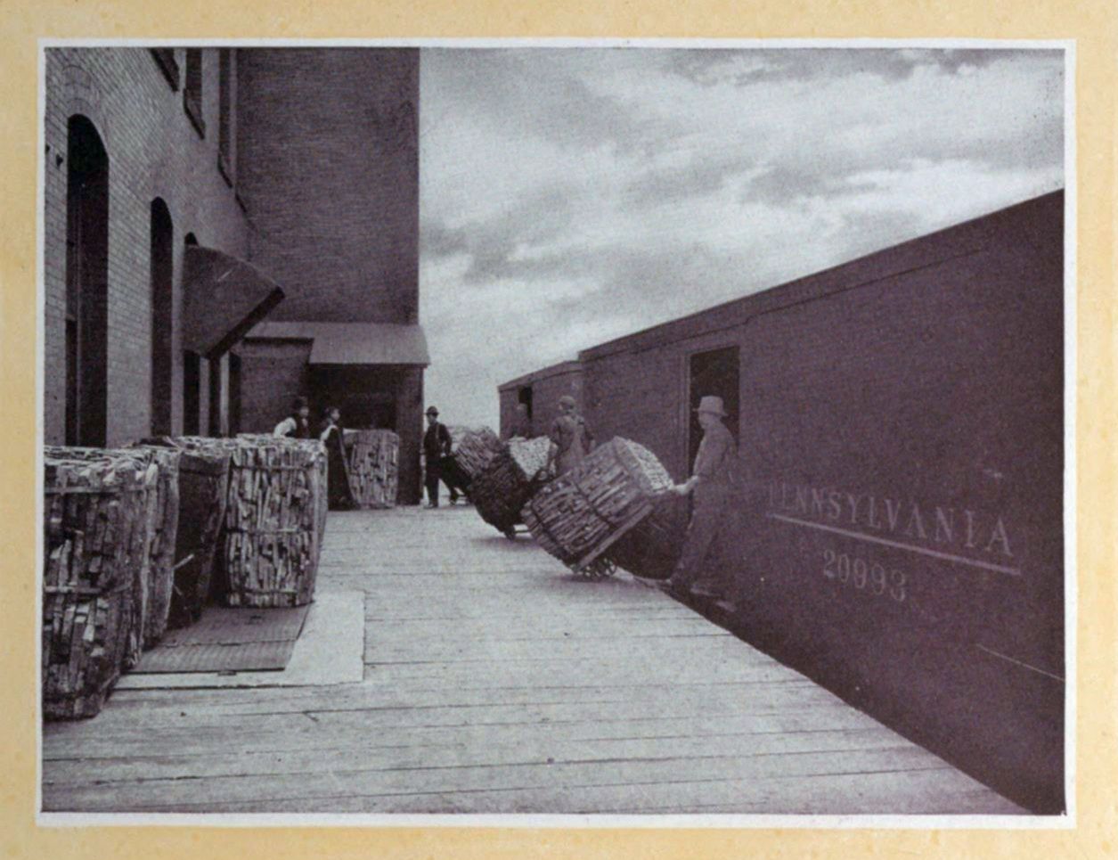 Each bale is carefully stenciled with marks indicating grade or quality. Loaded directly into ocean-going steamers alongside the Seville docks, not infrequently a whole ship’s cargo of cork at a time is transported to Philadelphia, New York, or Baltimore, and thence freighted to the Pittsburgh factory.