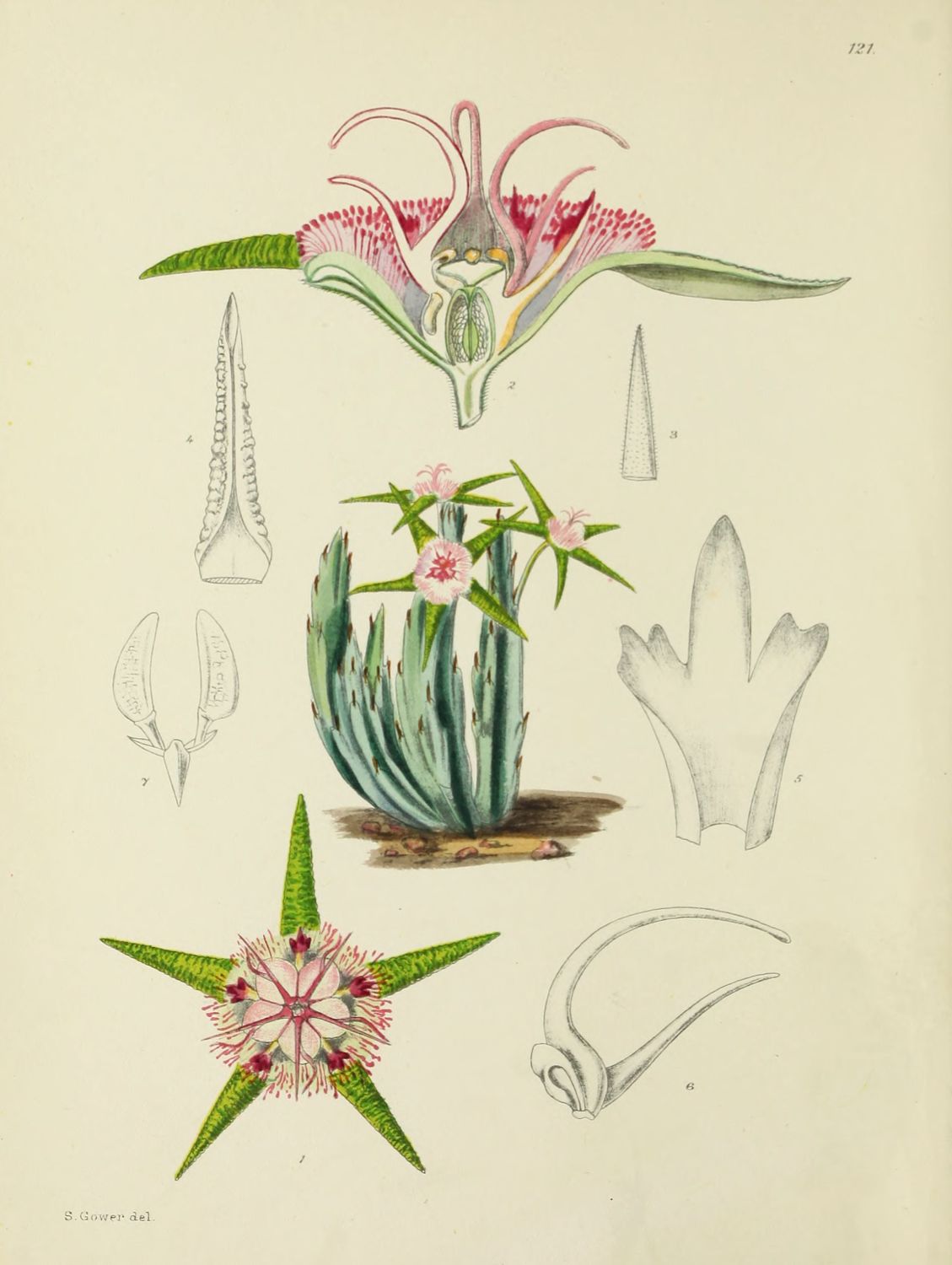 Plate 121.—Fig. 1, surface view of flower; Fig. 2, median longitudinal section of flower; Fig. 3, sepal; Fig. 4, petal; Fig. 5, outer corona; Fig. 6, inner corona and pollen sac; Fig. 7, pollinia.