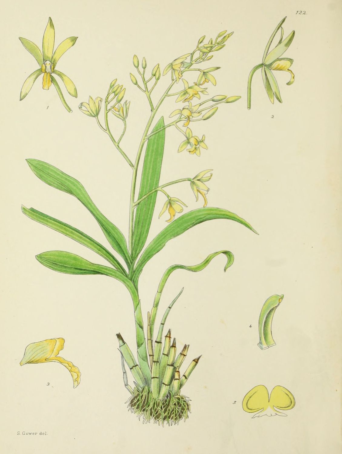 Plate 122.—Figs. 1, 2, front and side view of flower; Fig. 3, lip; Fig. 4, column; Fig. 5, pollinia.