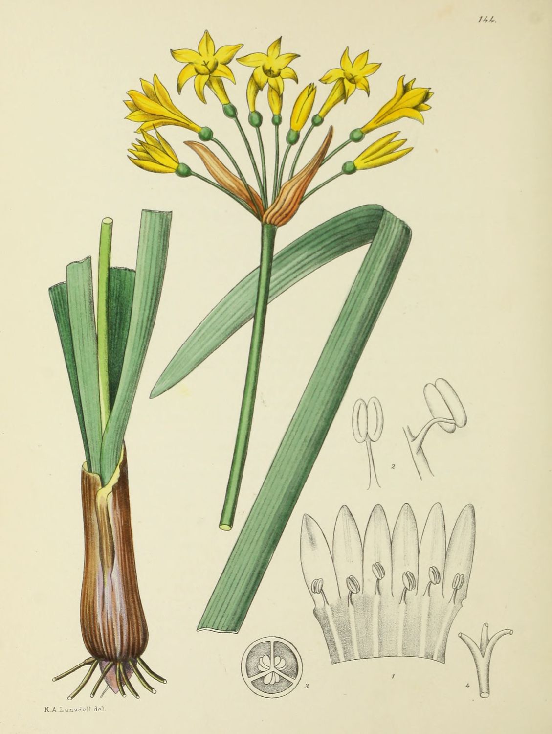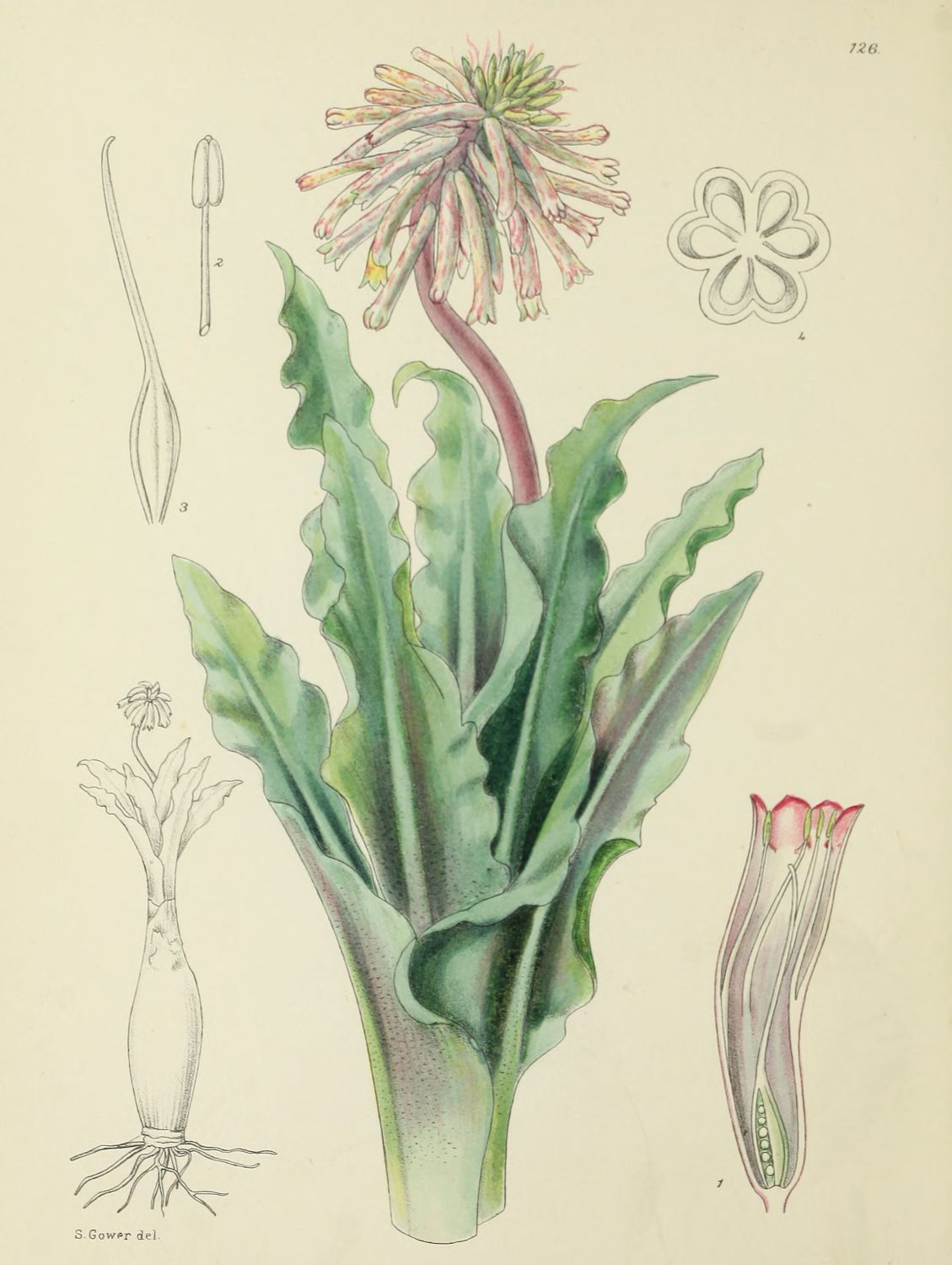 Plate 123.—Fig. 1, median longitudinal section of the flower; Fig. 2, stamen; Fig. 3, portion of style with the stigma; Fig. 4, the 2 carpels with a cupular disk at the base.