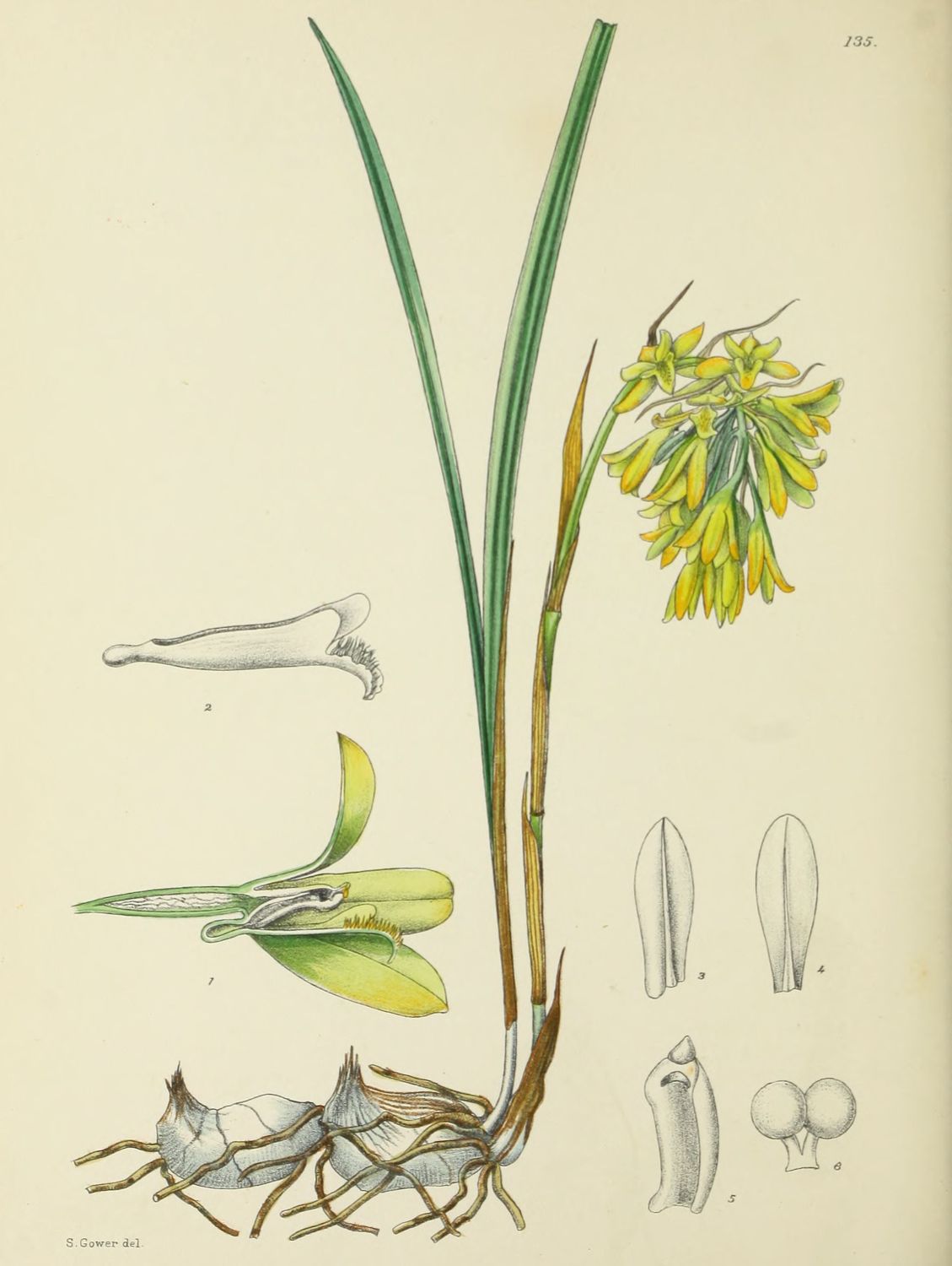 This epiphytic orchid belongs to a tropical African genus of about 6 species, and is the only representative which occurs in South Africa. The flowers are a pale lemon colour, sometimes barred or blotched with brown. Specimens were sent to England from Natal prior to 1857, and might be considered, as was suggested by Hooker and the late Dr. Bolus, a colour variety of the tropical African Ansellia africana. Mr. Rolfe in the Flora Capensis considers it to be a distinct species, as described by Reichenbach, and we have followed his naming. The figure given by Bolus (Ic. Orch. Austro-Afric. 11. t. 29) represents a colour form different from that reproduced here.
