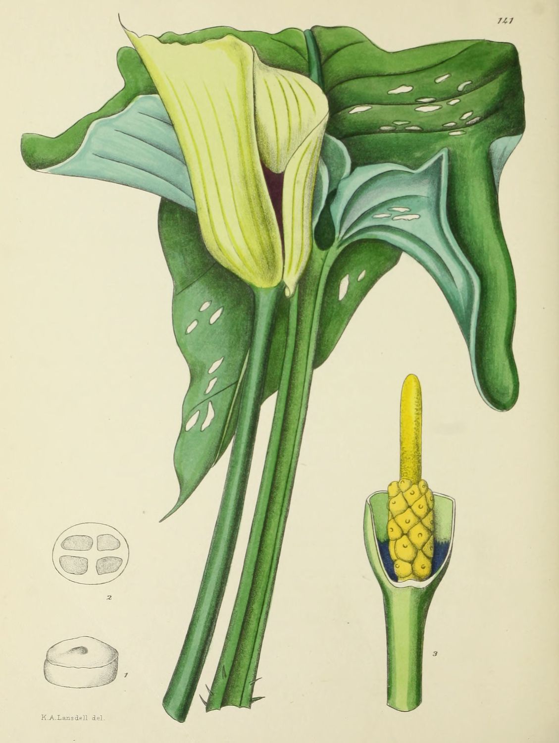 Plate 124.—Fig. 1, portion of leaf showing white spots; Fig. 2, median longitudinal section of the flower; Fig. 3, outer perianth-segment; Fig. 4, inner perianth-segment; Fig. 5, anther with part of the filament; Fig. 6, top of style showing the simple stigma.