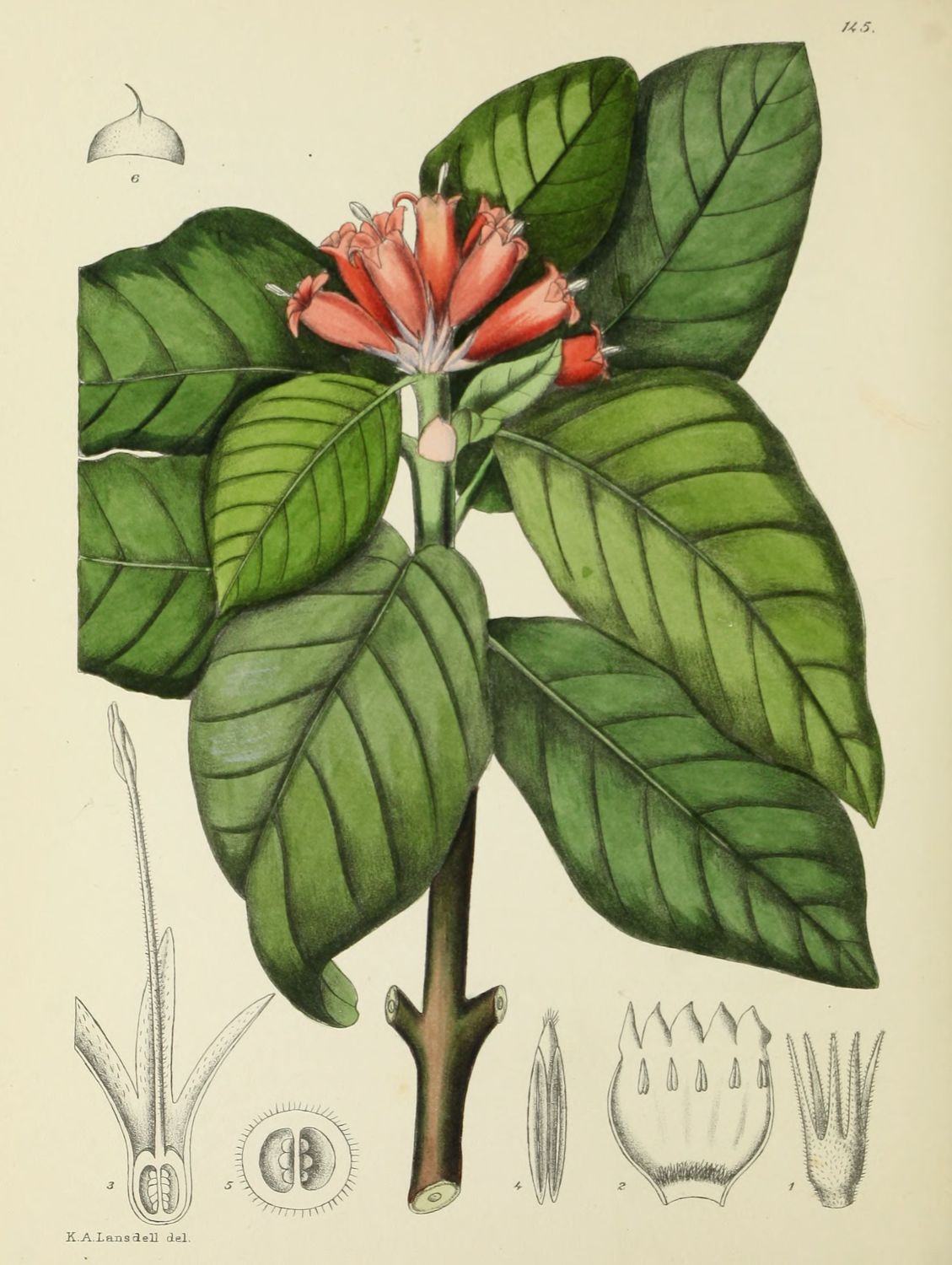 Description:—Inflorescence arising in an umbellate manner at apex of stems, up to 11-flowered. Sepals 4 mm. long, 3·5 mm. broad, ovate, acuminate, acute, glabrous. Corolla-tube 3·5 cm. long, cylindric and 1·2 cm. long below, with a subglobose base, then suddenly dilated and narrowed towards the apex, glabrous without, pilose within; lobes 2·2 cm. long, 1·8 cm. broad in the widest part, straight on{16} one side, very convex and crisped on opposite side, subacuminate, acute. Filament 3 mm. long, 2 mm. broad, ovate, with a ciliated hood at the base; anthers 6·7 mm. long, linear with a lanceolate, acute appendage 1·5 mm. long, and a membranous pouch at the base. Style 1·3 cm. long, terete, glabrous; stigma club-shaped covered with a white opaque jelly-like substance; ovary 3·5 mm. long, with a cupular disk at the base (National Herb. 2736).