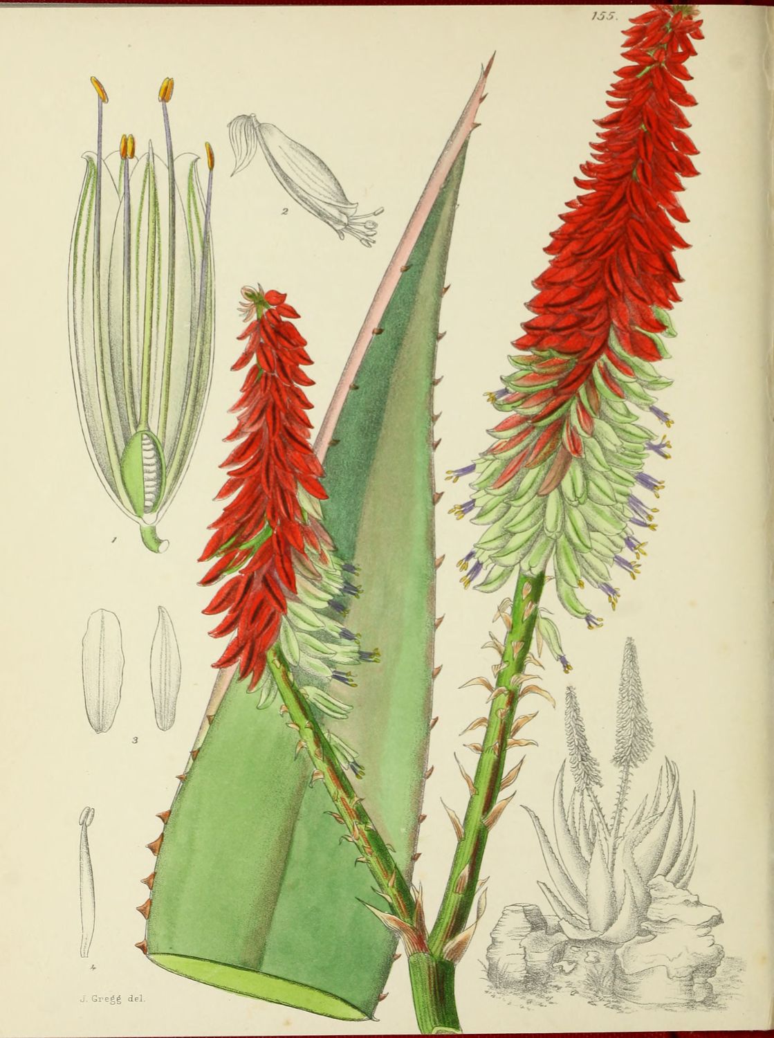 Description:—Stem short. Leaves 8-10, distichous, deciduous, 25-35 cm. long, 8-10 mm. broad at the base, narrowly linear, distinctly channelled, rounded at the back, with numerous minute raised white spots at the base, armed along the edges with delicate white teeth 2-7 mm. apart. Peduncle stout, 25 cm. long, clothed with broad ovate shortly cuspidate green empty bracts. Raceme more or less capitate. Bracts 20 mm. long, 15 mm. broad, ovate, acute. Pedicels 25 mm. long. Perianth peach-red to scarlet, greenish towards the apex, 26-30 mm. long, 12 mm. in diameter, straight, very markedly 3-angled, contracted towards the mouth; segments free. Style and stamens not or scarcely exserted (National Herb. 2743).{20}