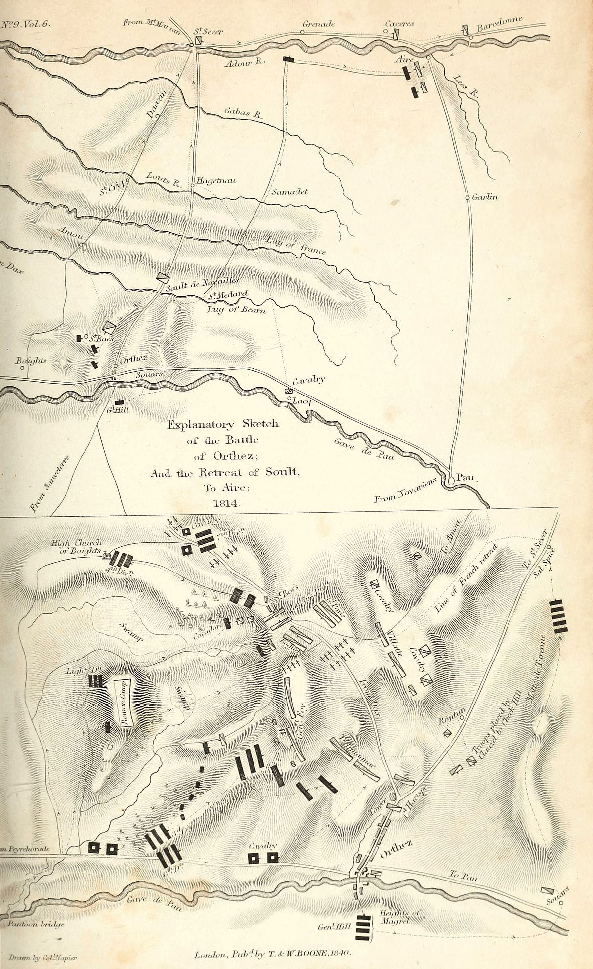 | Lord Wellington arrests his movements and returns in person to St. Jean de Luz to throw his bridge over the Adour—Is prevented by bad weather and returns to the Gave of Mauleon—Passage of the Adour by sir John Hope—Difficulty of the operation—The flotilla passes the bar and enters the river—The French sally from Bayonne but are repulsed and the stupendous bridge is cast—Citadel invested after a severe action—Lord Wellington passes the Gave of Oleron and invests Navarrens—Soult concentrates his army at Orthes—Beresford passes the Gave de Pau near Pereyhorade—Battle of Orthes—Soult changes his line of operations—Combat of Aire—Observations | 536 |