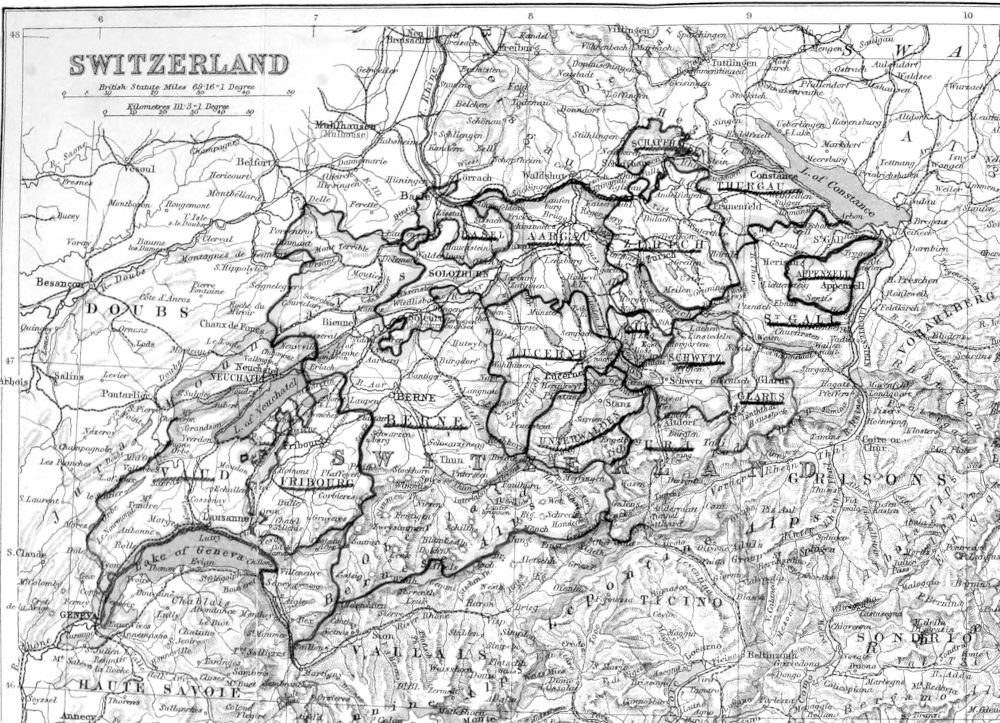 It has been disputed to whom the priority in the race of reform in Switzerland belongs, Zwingli or Luther. Zwingli himself declares that in 1516, before he had heard of Luther, he began to preach the gospel at Zurich, and to warn the people against relying upon human authority. The name of Zwingli is always associated by the Swiss with the rise of Protestantism as that of Calvin is with its triumphant progress.11 This Reformation, introduced by Zwingli and extended by Calvin, occasioned the fiercest dissensions. Early in the sixteenth century both Geneva and Zurich became cities of refuge for French, Italian, and English who were forced to flee from their native lands on account of their faith. The first edition of the English Bible was printed in Zurich in 1535. The Reformers separated themselves into Lutherans, Calvinists, and Anabaptists. It was held to be the duty of each Canton to force its own faith upon the whole body of the people; church-going was enforced by fines and corporal[Pg 29] punishment; staying away from church on Sunday mornings, in some localities, was followed by a loss of citizenship. The latter part of the sixteenth and the whole of the seventeenth century are crowded with controversies and bloodshed; that violence and those animosities which are found so terribly to prevail where religious zeal has been abused for the purposes of intolerance. Nowhere were the doctrines of the Protestant Reformation more ardently embraced; nowhere was the strange moral phenomenon, which is to be traced in so many quarters of Europe, more conspicuous than among the Cantons of Switzerland, the early, exact, permanent, geographical division, which was realized between the Protestant and Popish communities; a division which frequently an insignificant stream or street has been sufficient to maintain for ages. Religious parties, like glaciers, became at once frozen up in set attitudes and forms, which no subsequent events have been able to alter. In three instances controversies on the subject of religion kindled violent and bloody contests. The most memorable was the war between Bern and Zurich, on the one part, and five little Catholic Cantons on the other, in 1712. At the close of the period of the Reformation, seven of the Cantons, Luzern, Schwyz, Uri, Unterwalden, Zug, Freiburg, and Solothurn adhered to their ancient Catholic faith; the Cantons of Bern, Basel, Zurich, St. Gallen, and Schaffhausen adopted the reformed religion; Appenzell and Glarus recognized both forms of worship. In Geneva, over which the Duke of Savoy ruled, the effects of the Reformation were peculiarly important. Calvinism, as it existed at Geneva, was not merely a system of religious opinion, but an attempt to make the will of God, as revealed in the Bible, an authoritative guide for social and personal as well as for moral direction. Moral sins were treated after the example of the Mosaic law, as crimes to be punished by the magistrates; “elsewhere,” said Knox, speaking of Geneva, “the word of God is taught[Pg 30] as purely, but never anywhere have I seen God obeyed as faithfully.”12