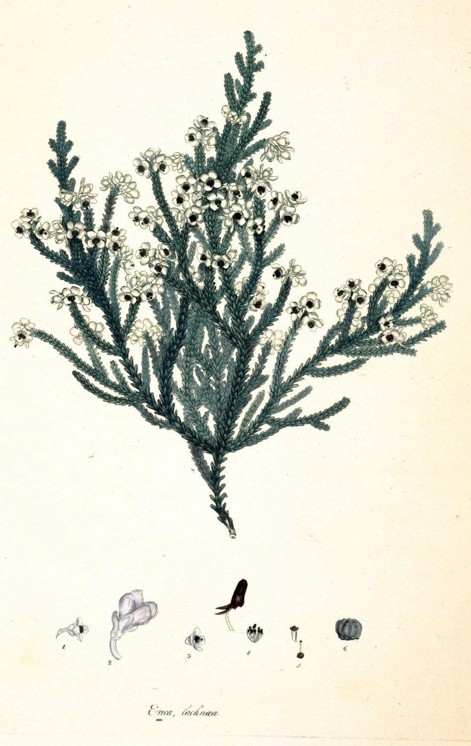 1. Pagina inferior Folii lente aucta. 2. Calyx et Corolla. 3. Stamina et Pistillum, lente aucta. 4. Flos. 5. Calyx lente auctus. 6. Germen lente auctum. |