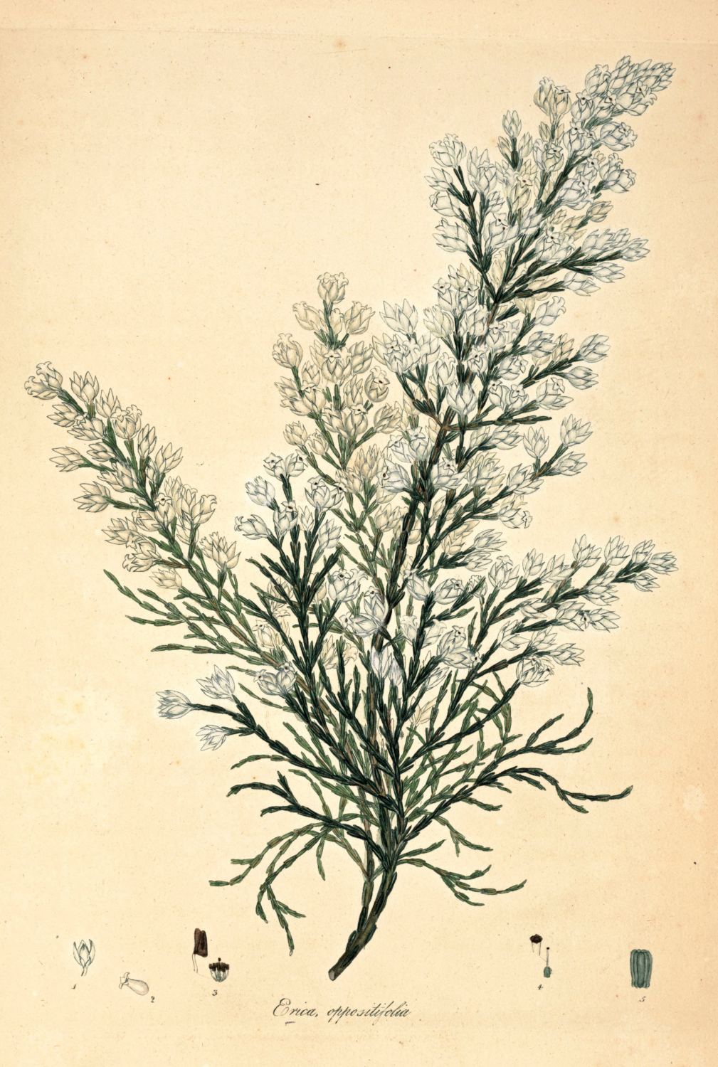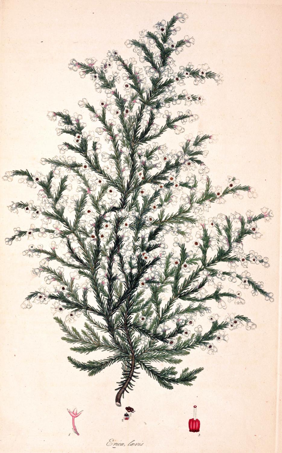 Heath, with beardless tips, without the blossom. Flowers hairy, pitcher-shaped, and white. Cup hairy, with green edges. Leaves by threes, rolled back at the edges, and hairy. Stem weak.