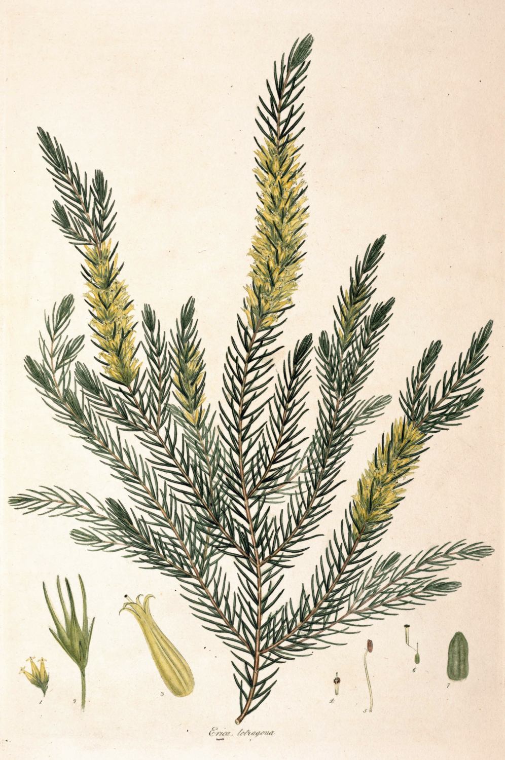 Heath, with beardless tips, within the blossom: leaves bristle-shaped, long, and crowded: flowers grow in whorls, of a yellow colour: stem upright.
