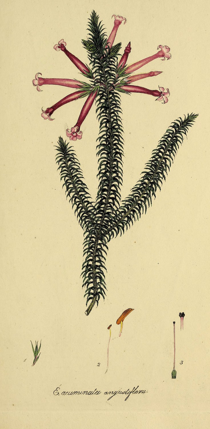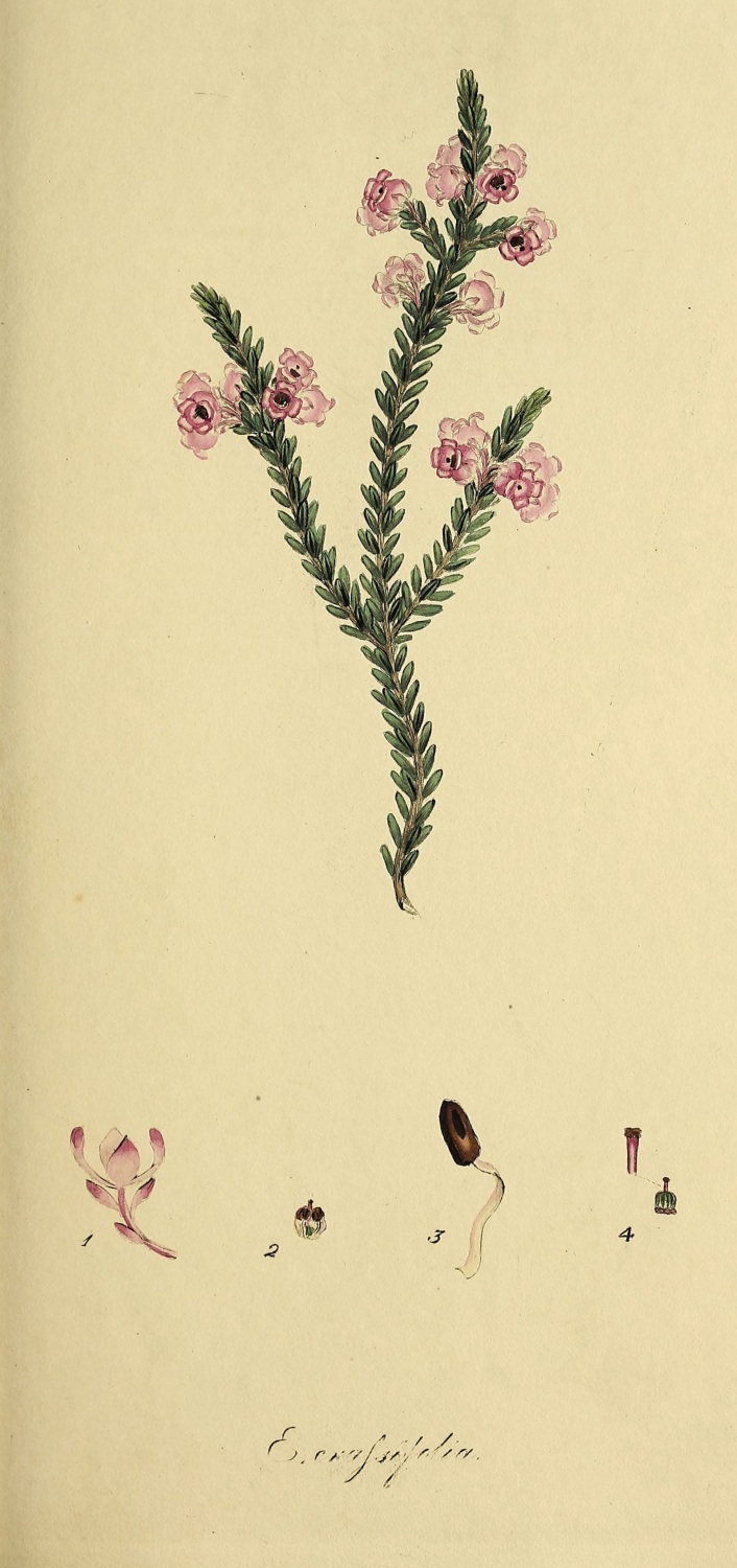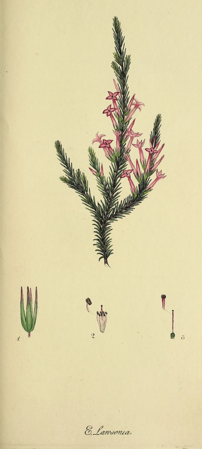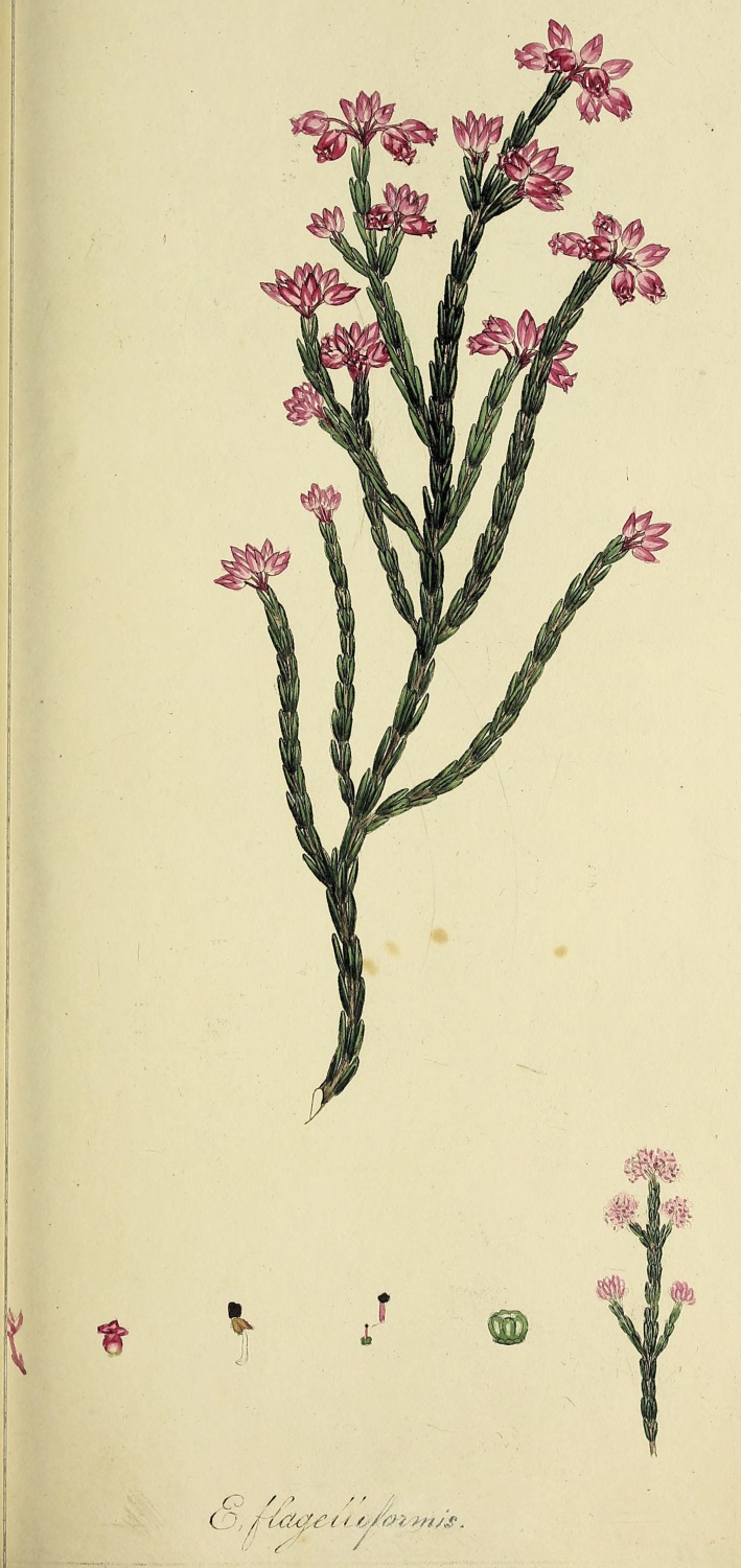 Tips beardless, just within the blossom. Flowers terminate the branches, mostly by threes, ascending, and spreading. Blossom cylindrical, rose-coloured, downy, and pellucid: segments of the border equal, and rolled back. Leaves by threes and fours, linear and short, slightly incurved, three-sided, pointed, and smooth. Stem shrubby, a foot and a half high. Branches numerous, flexuose, twiggy, and thread-shaped.