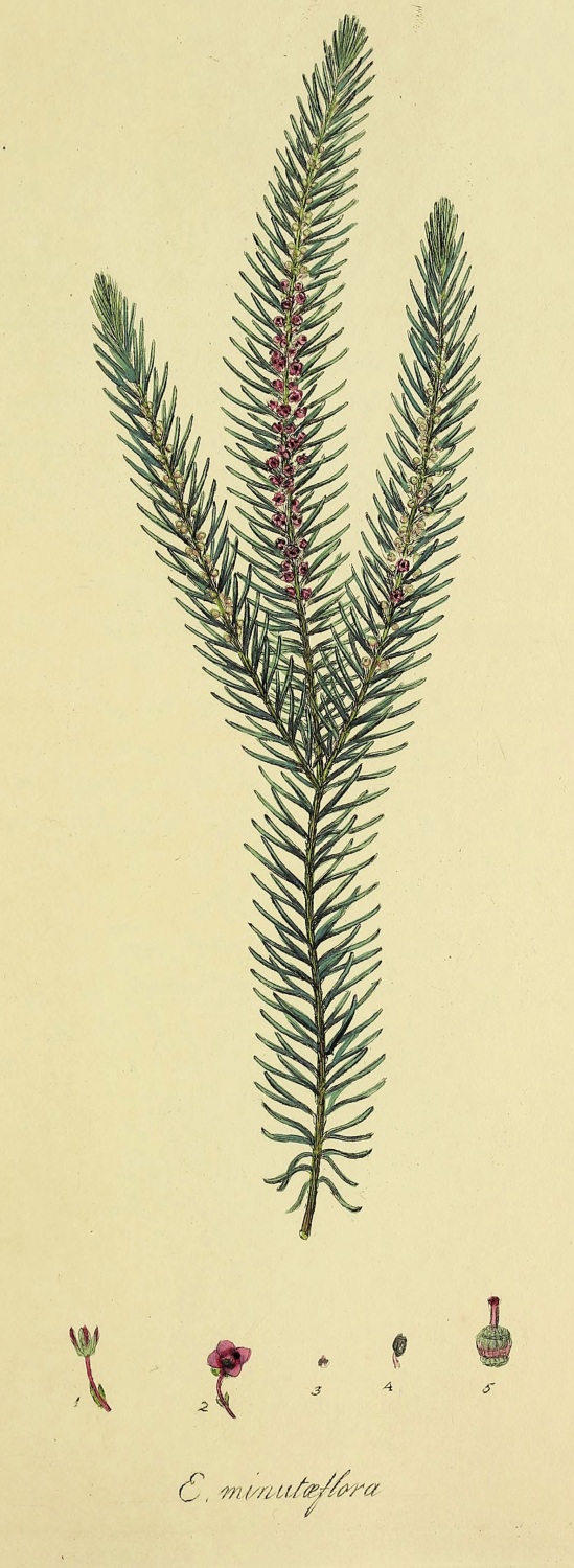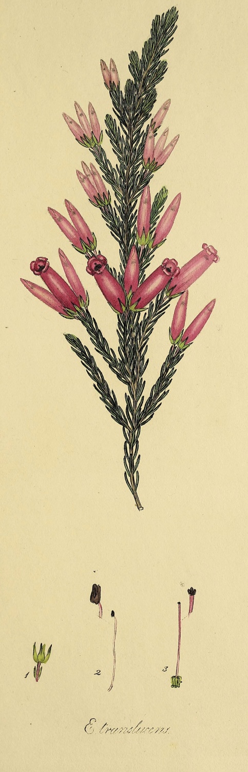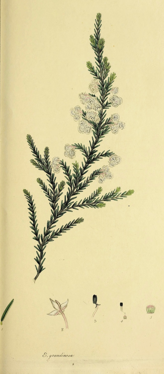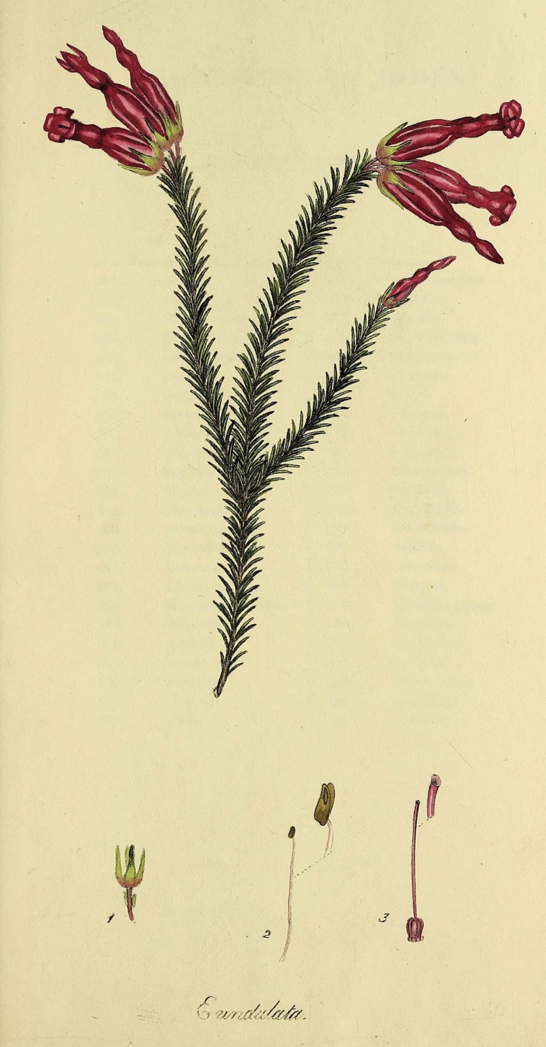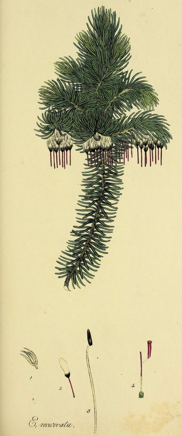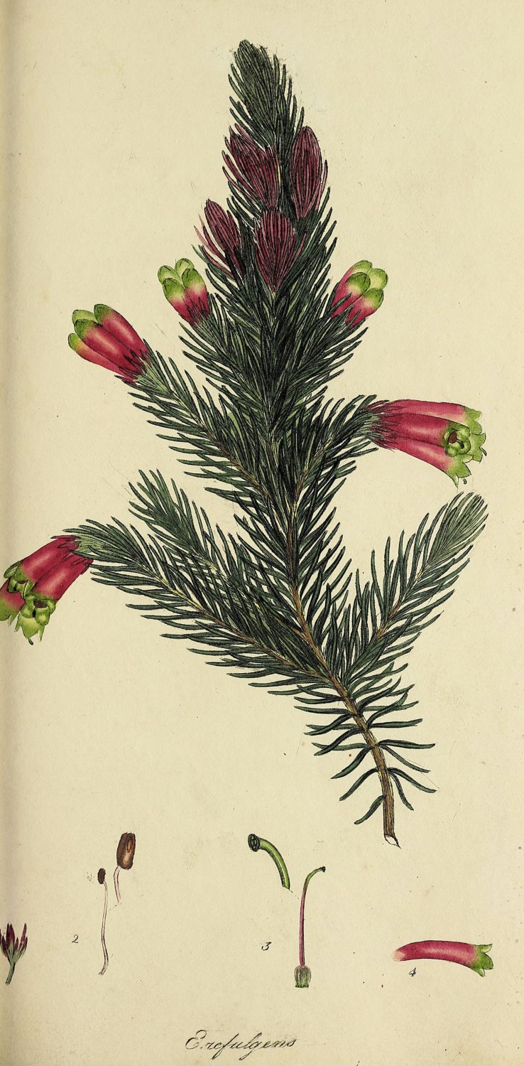 Tips beardless, within the blossom. Flowers terminate the branches, mostly by threes. Blossom flask-shaped, ribbed, undulated, and of a red colour. Leaves by threes, linear, short, and ascending in irregularly crowded whorls. Stem shrubby. Branches twiggy, and flexuose.