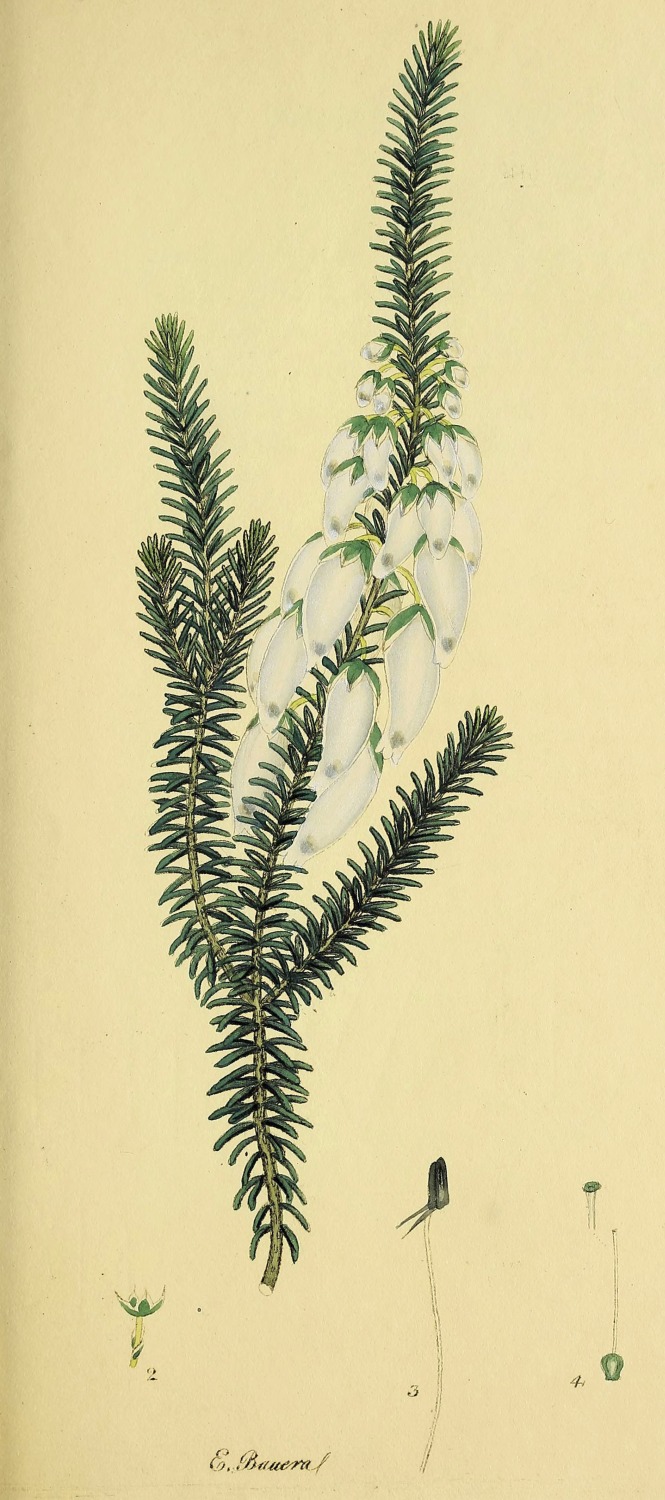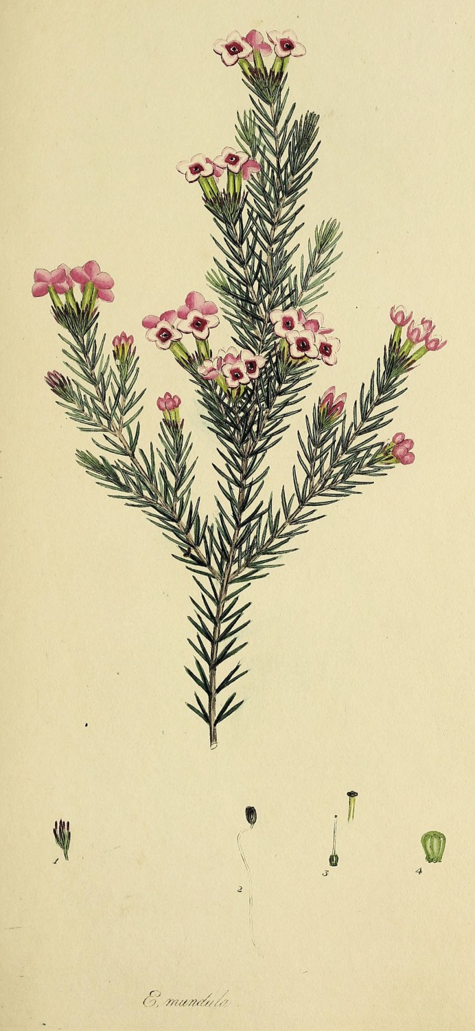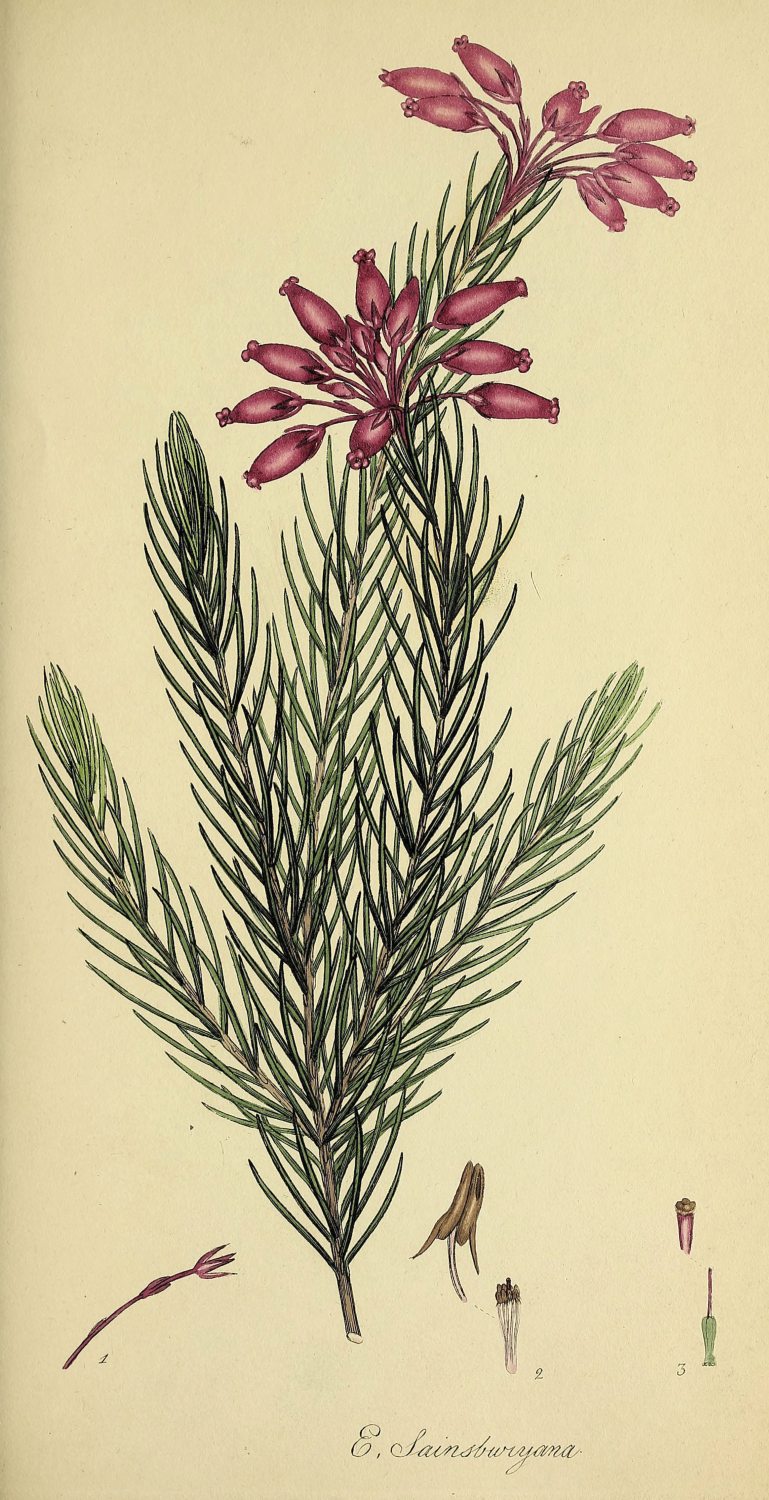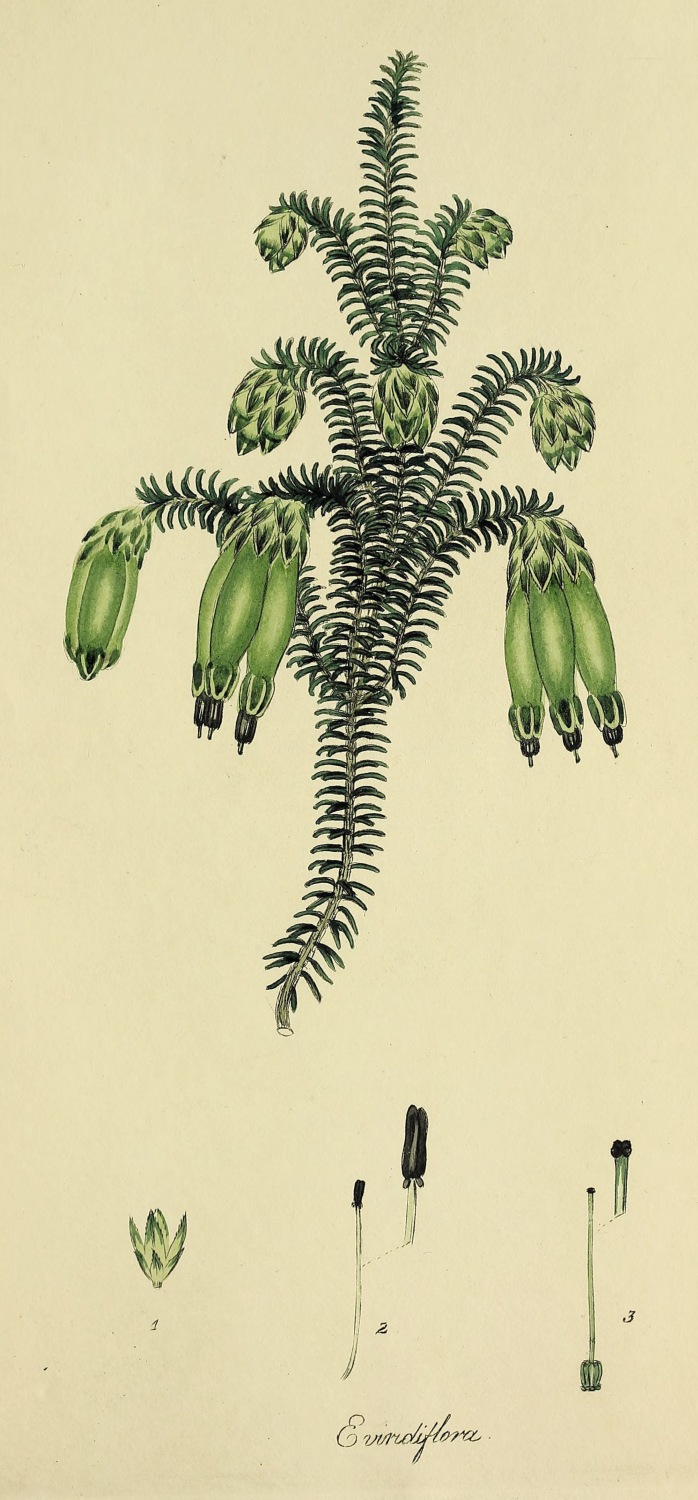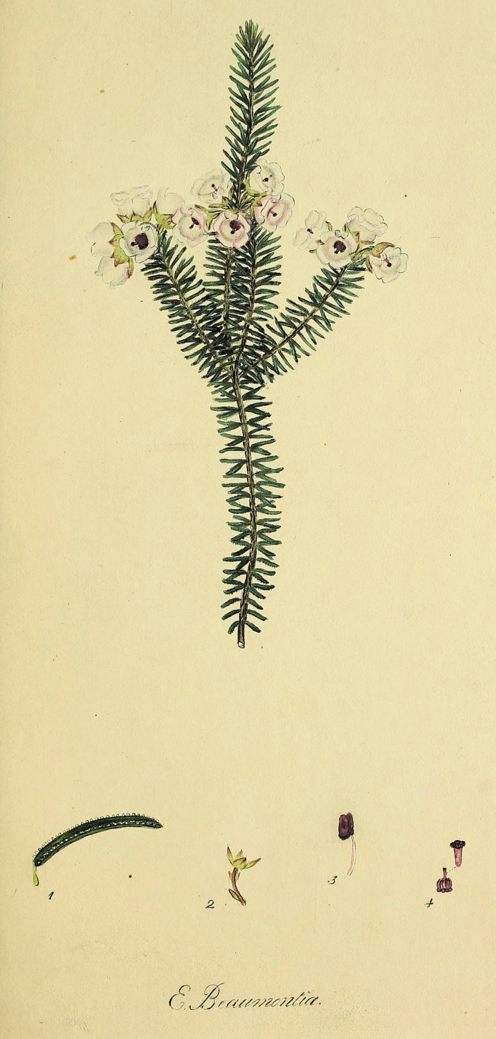 Tips beardless, within the blossom. Flowers terminate the branches, mostly by threes. Blossom flask-shaped, ribbed, undulated, and of a red colour. Leaves by threes, linear, short, and ascending in irregularly crowded whorls. Stem shrubby. Branches twiggy, and flexuose.