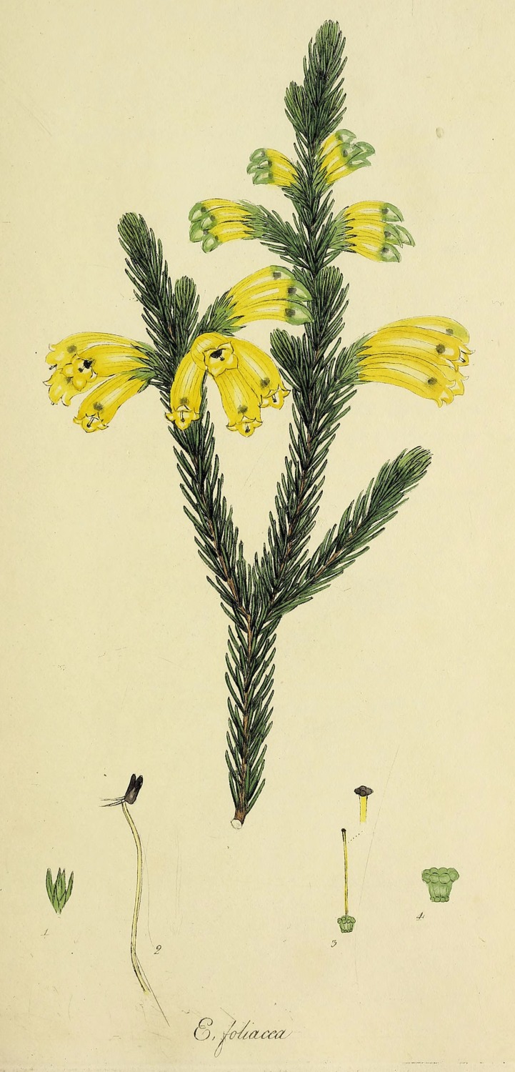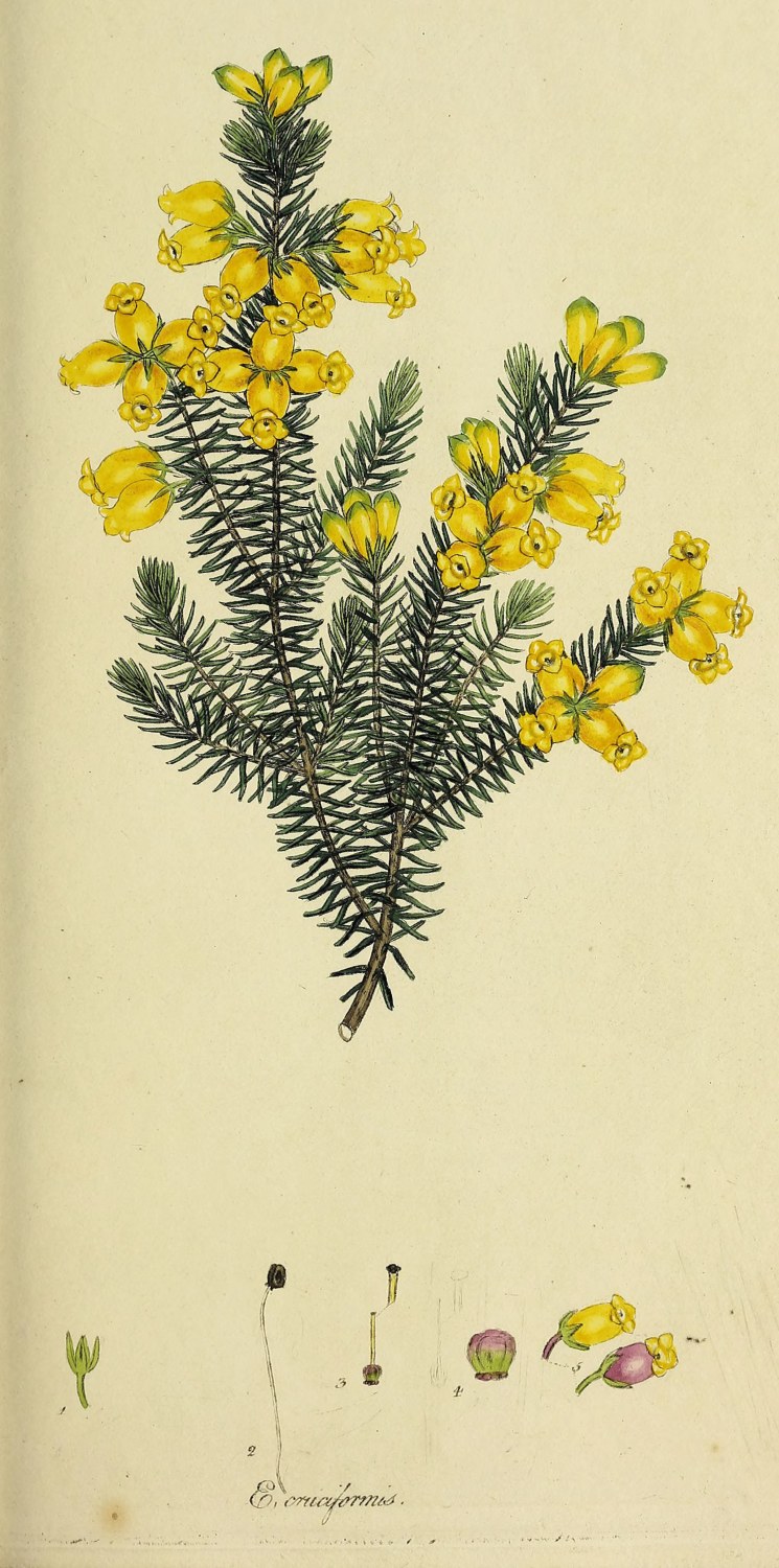 Tips two-horned, and within the blossom. Flowers grow terminal, on very short branches, mostly by fours. Blossom jar-shaped, shining, gold-coloured, and narrowed at the mouth: segments of the border spreading. Leaves by fours, linear, spreading, and smooth. Stem shrubby, a foot or more high: branches numerous.